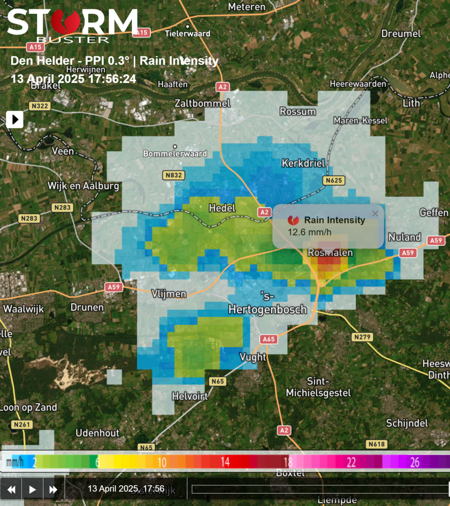 Op de radar was inderdaad even een 'rood pitje' te zien, precies boven Rosmalen. Ik wil ook wel even zo'n bui hoor, na al die droogte van de laatste tijd. Liefst met onweer