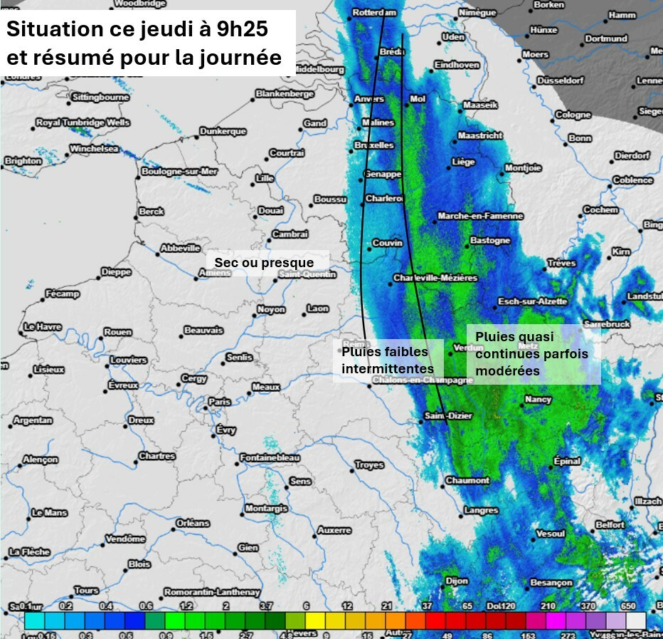 Sinds gisteren om 5u 's ochtends is er langs de Duitse grens al tussen de 15 en 20 l/m² gevallen, en het dubbele wordt nog verwacht tegen morgennamiddag. Ten oosten van een lijn Gedinne–Hasselt kan er nog 5 tot 15 l/m² bijkomen. Tussen deze lijn en die van Geel–Florennes blijven de neerslaghoeveelheden beperkt (1 tot 5 l/m²