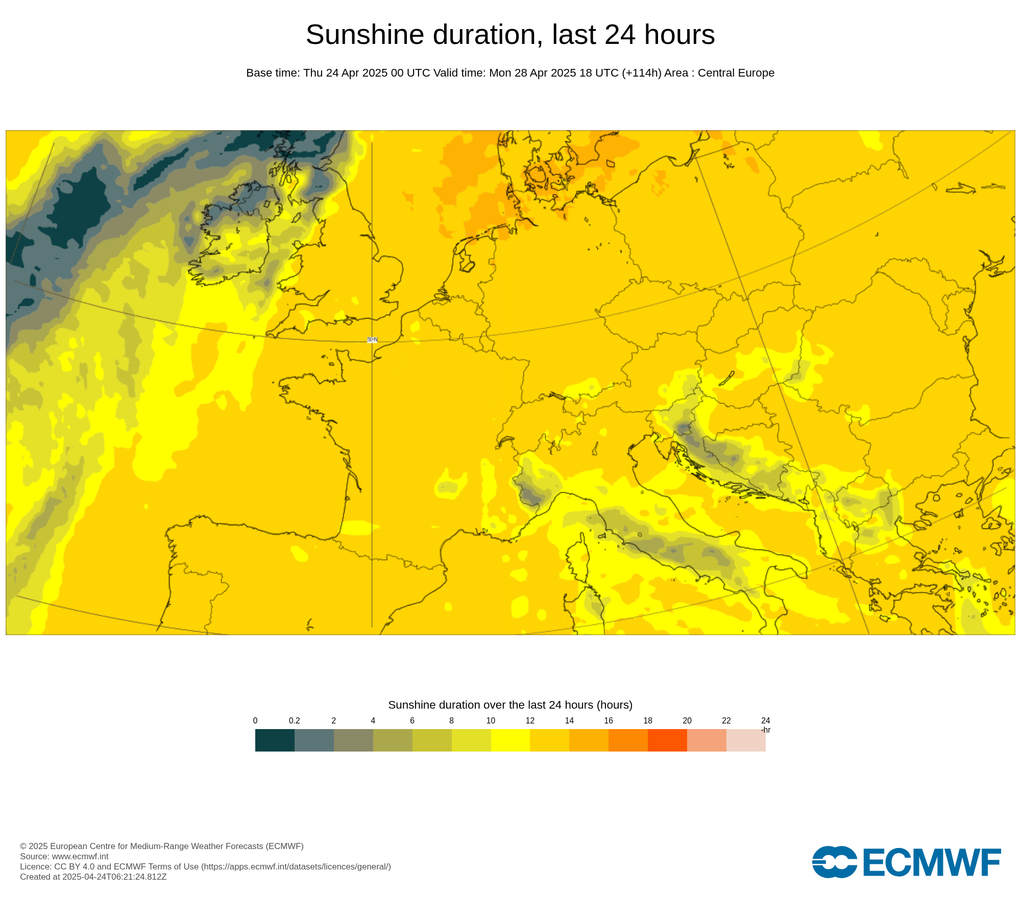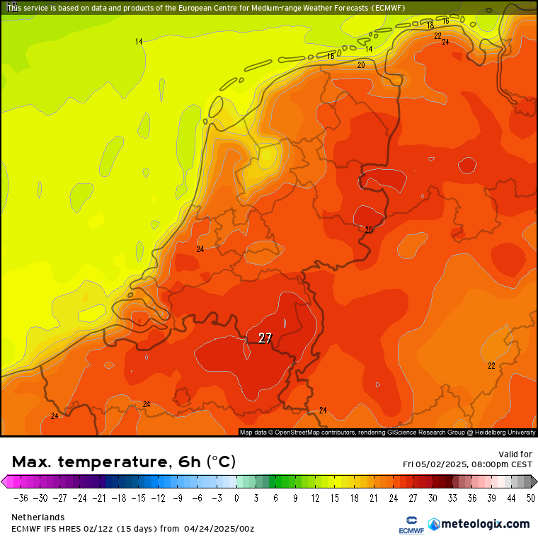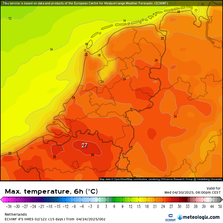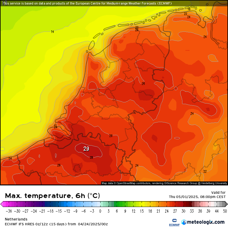 Rekening houdend met de bias van ECMWF voor de maximumtemperaturen in het voorjaar al snel 7 dagen op rij temperaturen van 20 graden of meer in het zuiden van de Benelux, beginnend op zondag. Vooral van 30 april t/m 2 mei zeer warm. De ruwe uitvoer komt dan met regionaal 27 - 29 graden. Daarbij blijft het na vandaag ruim een week volledig droog, met op de meeste dagen alleen maar zonneschijn.