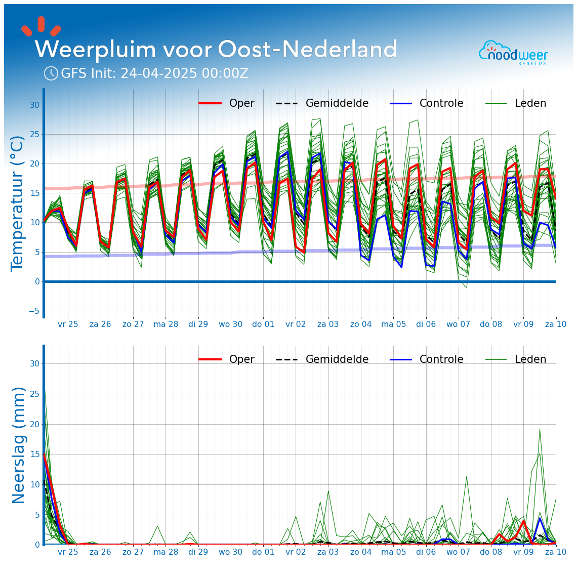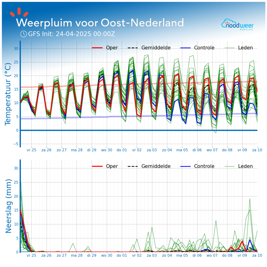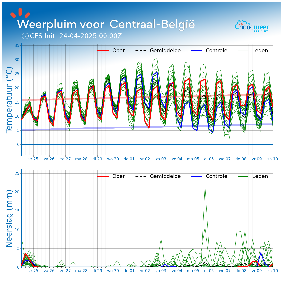 Hier is de weerpluim op basis van de maximumtemperaturen. Ik neem er even 1 mei uit, daar ligt het gemiddelde inderdaad lager, maar er is evenzeer ondersteuning voor de warme optie van EPS. Al bij al zijn de pluimen vrij gelijkaardig (stijging temperatuur), alleen blijft er een noordoostcomponent inzitten (GFS) of niet, want dat zorgt voor de "grote" verschillen. In Centraal-België gaat het gemiddelde wel gewoon richting 25°C, dus dat toont die noordoostelijke invloed wel aan. En oh ja, qua neerslag zijn er wel voldoende gelijkenissen