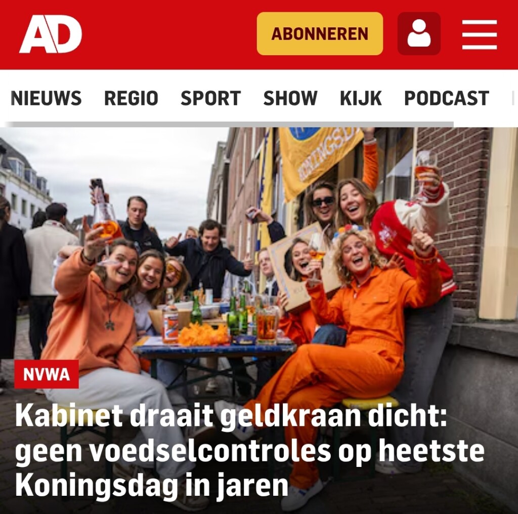 Althans, dat zou je haast gaan denken als deze kop in het AD van deze morgen ziet. De heetste Koningsdag in jaren...terwijl het maximaal ergens misschien 20°C wordt. Dit is tegenwoordig het niveau van de media in Nederland en ik vind het om te janken.