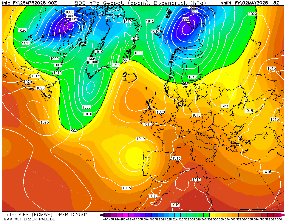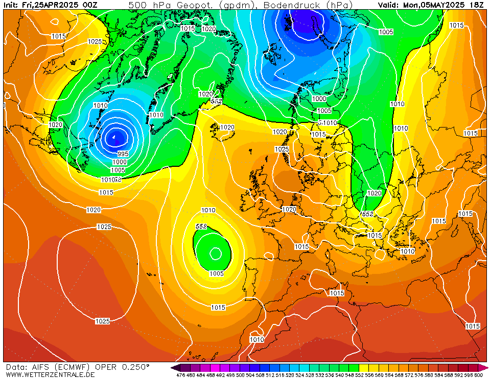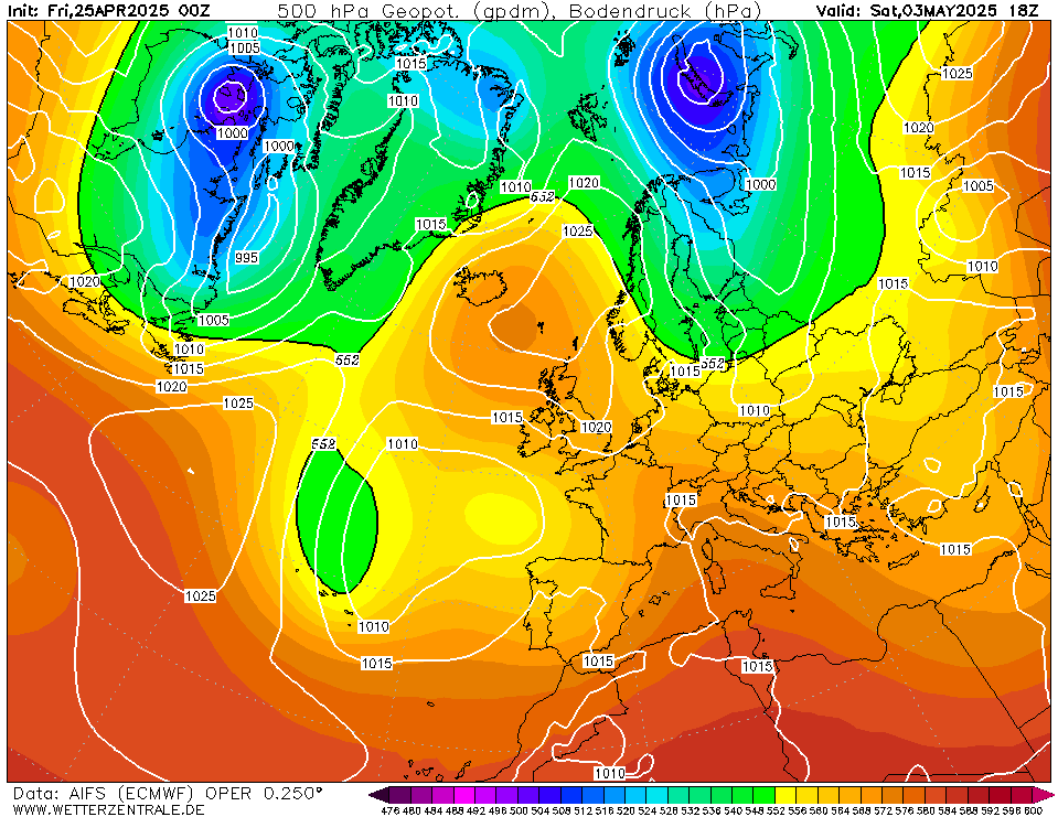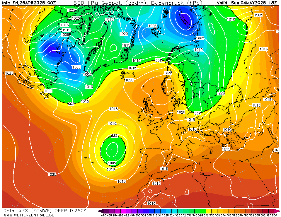 En het gemiddelde zit als nog rond de 20 graden, oftewel tegen de tijd dat de datum 2 mei dichtbij komt zijn de scherpe kantjes er waarschijnlijk wel vanaf, vooral omdat de AIFS scenario mij het meest realistisch lijkt; zo loopt het namelijk vaak af, de trog zakt uit richting Oekraïne, zie de kaart: