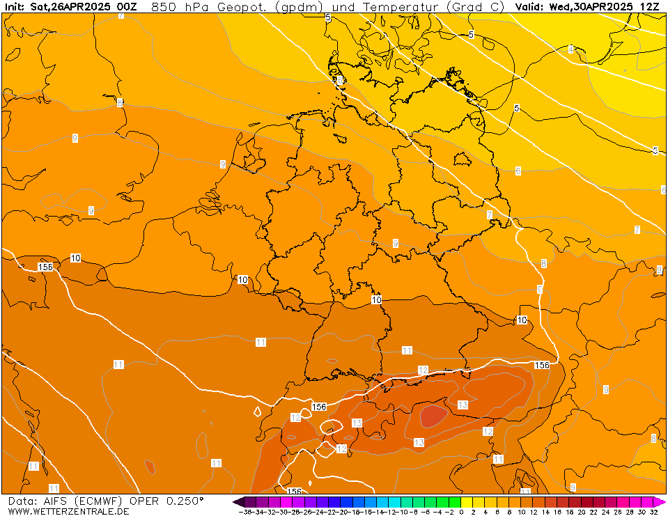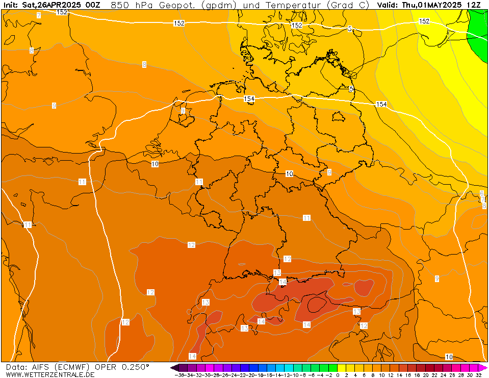 9 à 10 graden op 850 hPa, veel zon, weinig wind. Dus tel er 16 graden bij op en je komt vrij gemakkelijk op zomerse waarden uit. Zeker in het westen van de Benelux, waar de bodem ook nog behoorlijk droog is.