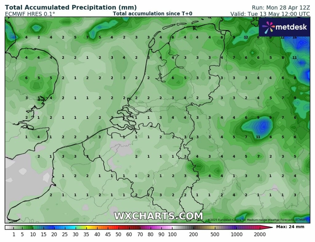 Operationele run komt met hooguit een paar millimeter regen de komende 15 dagen. De temperaturen gaan wel duidelijk om laag: op vrijdag en zaterdag landinwaarts nog wel warm (>20 graden), vanaf zondag niet meer. Daarbij een afwisseling van wolken en flinke zonnige perioden.