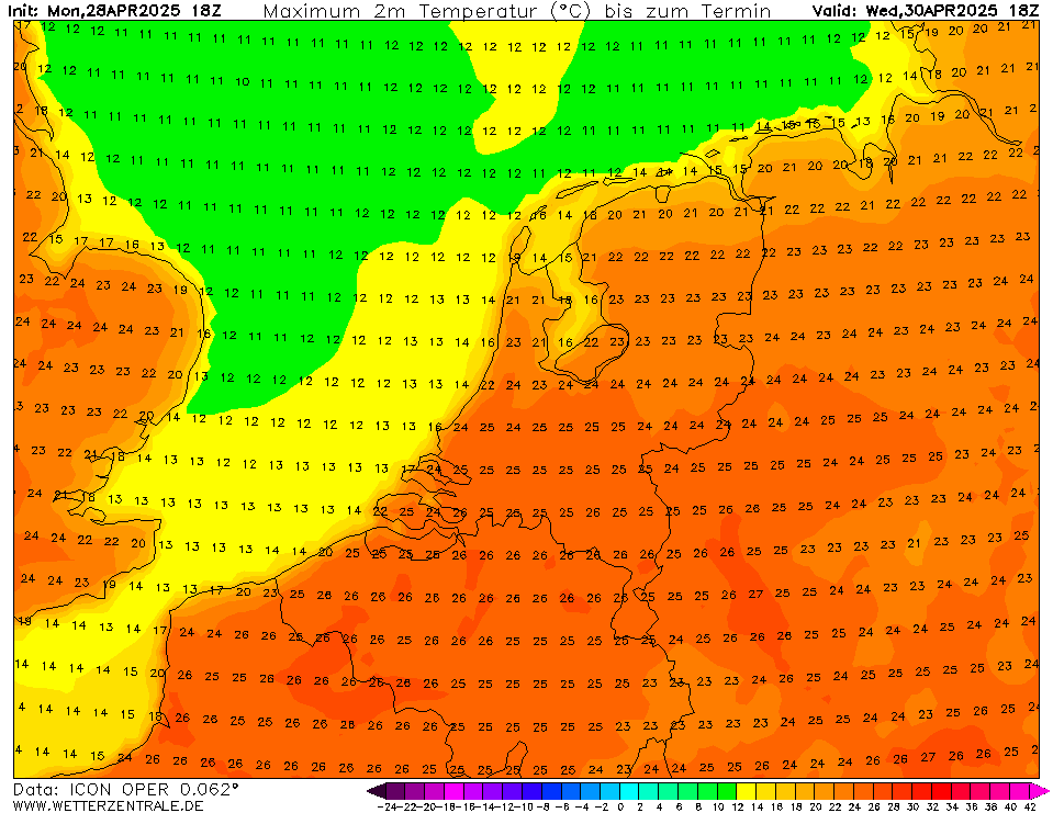 ICON18z: op grote schaal 27 à 28 graden donderdag