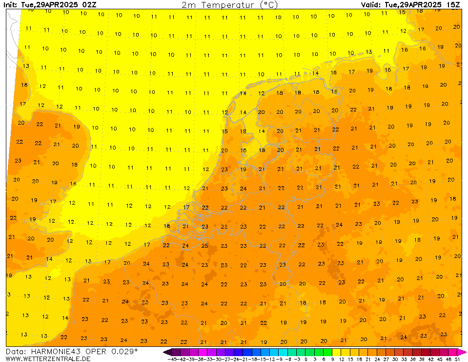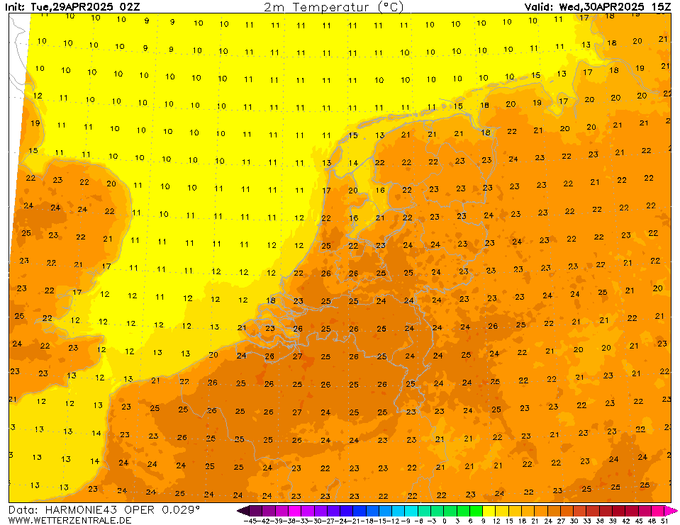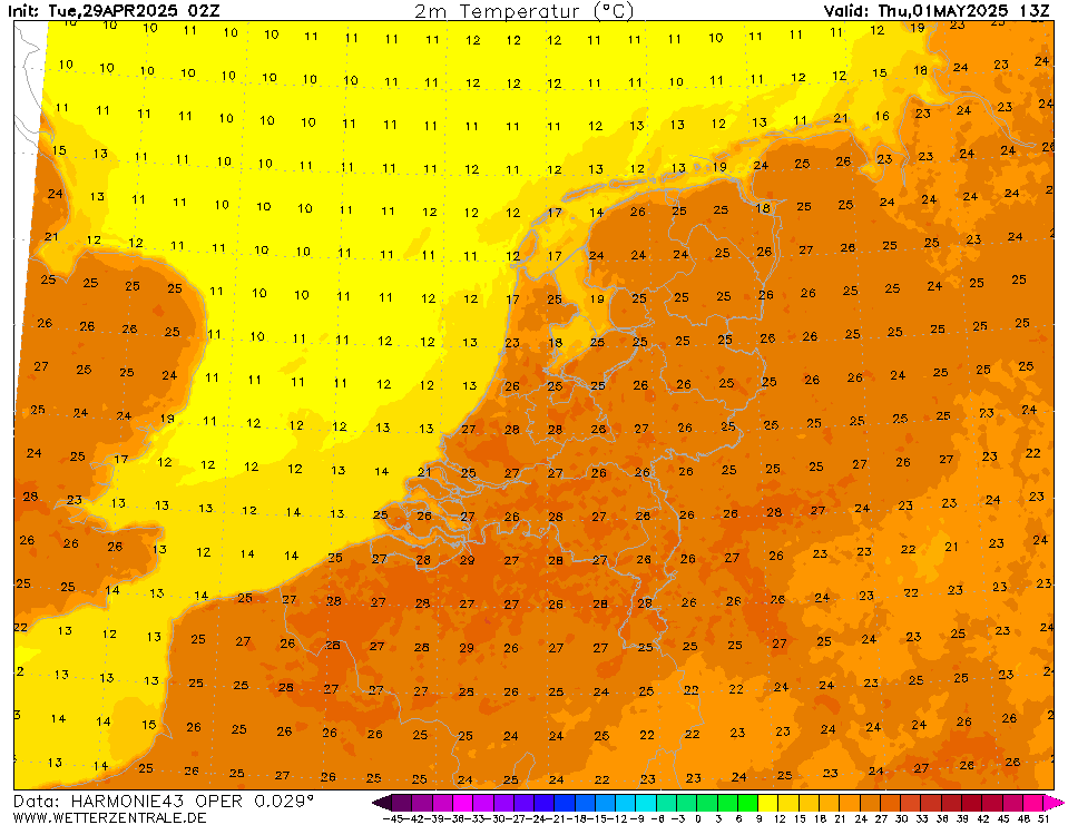 Donderdagmiddag in stedelijk gebied waarschijnlijk tegen de 30°C aan. De Bilt circa 27°C, dus het is dankzij een scherp dagrecord (28.5°C in 2005) dat er geen record zal sneuvelen voor de maximumtemperatuur (de dagen eromheen liggen de records veelal rond 26 à 27 graden).