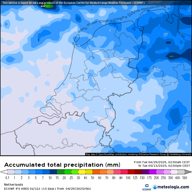 De nieuwe run in vrijwel heel de Benelux hooguit 1 of 2 millimeter aan neerslag zien voor de komende 15 dagen, gisterenavond toch nog op grotere schaal 2 - 5 mm, al was dat natuurlijk ook niet veel.
