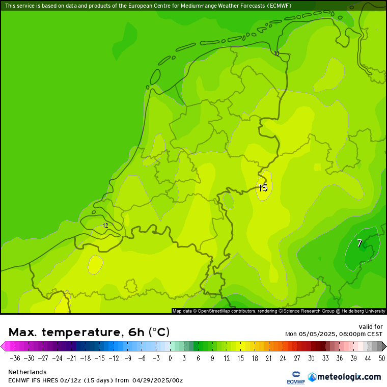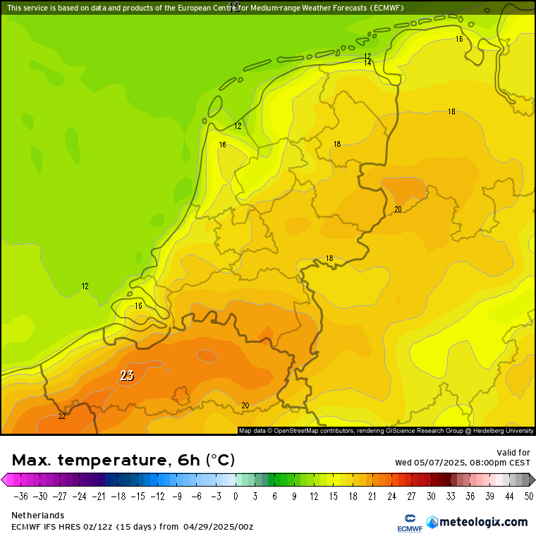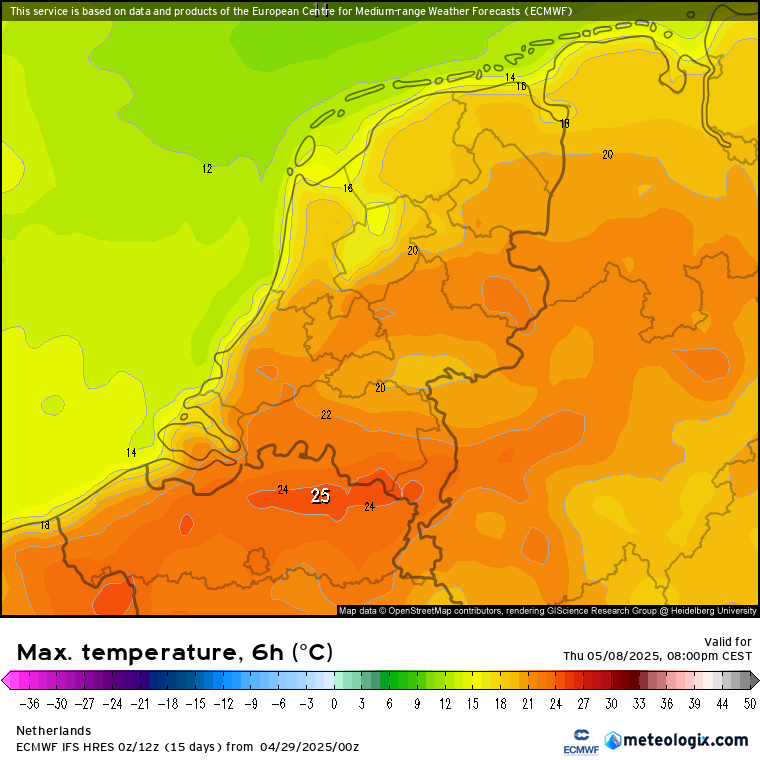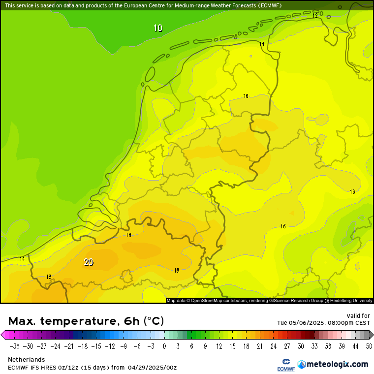 Wat daarnaast opvalt is de temperatuur: de nieuwe run toont na een dip op zondag en maandag (10 - 15 graden) alweer snel herstel. Volgende week dinsdag bijvoorbeeld 15 - 20 graden in de ruwe uitvoer, gevolgd door 16 - 23 graden op woensdag en 19 - 25 graden op donderdag.