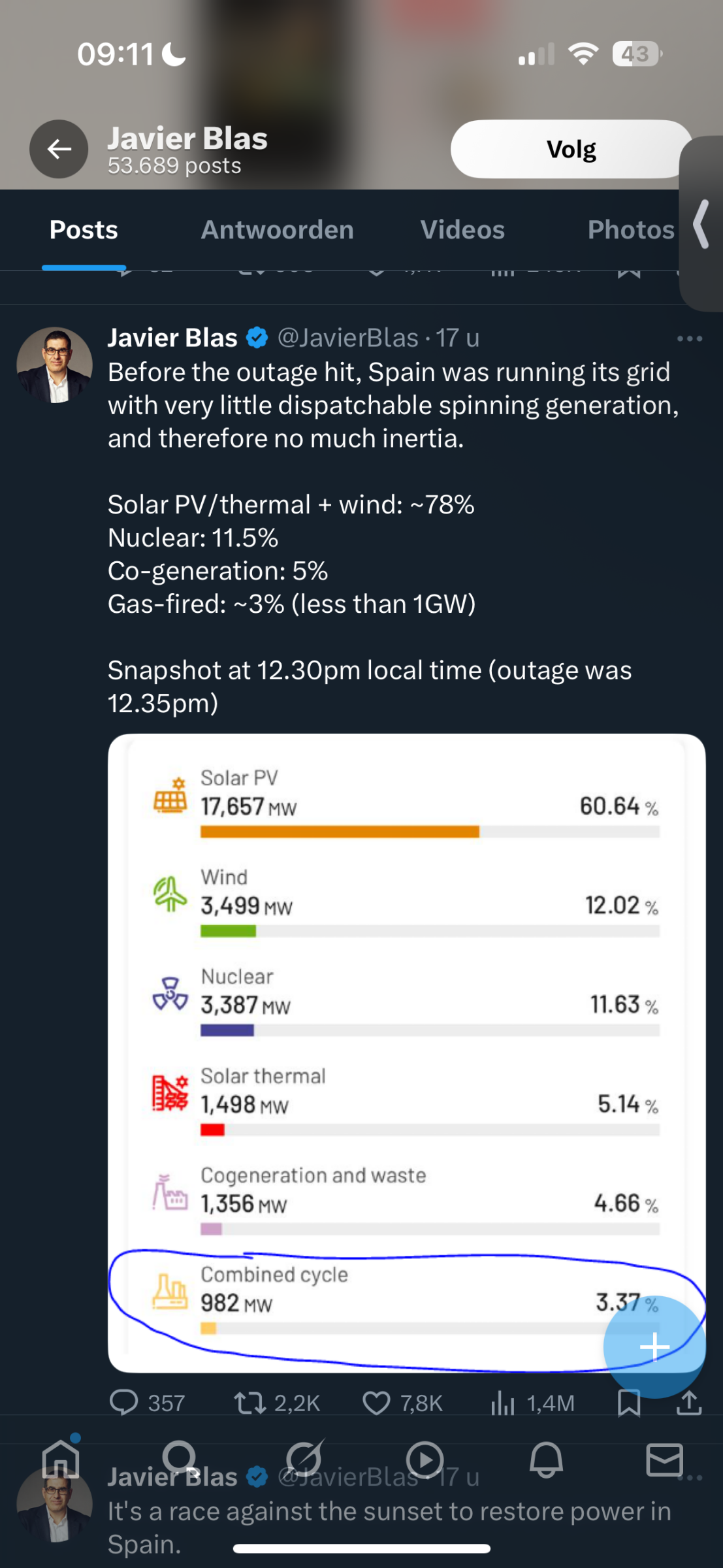 Kijk aan dat is wel een leuke bron idd, Javier even opgezocht, hier gaat het niet om zonnepanelen zoals jij schets - dat is eerlijk gezegd een veel te simpele voorstelling van zaken. Neemt niet weg; goed gevonden. Hij doelt voornamelijk op de grid opbouw op dat moment. Veel duurzaam en weinig constant en traditioneel, als het systeem dan ineens tript dan komen die traditionele systemen niet zo snel ineens bij, dan trekt je het net onderuit. Maar wat is dan de oorzaak dat het systeem ineens instort. Oftewel dat je dan voor 78% op renewables draait is een bevorderende omstandigheid waardoor je de poweroutes mogelijk niet hebt kunnen opvangen. Wel was er behoorlijk wat thermal en kernenergie - grote constante bron dus. De conventionele systemen zijn groot en log en vereisen vaak een ramp up van 12 tot 24u. Zoals bijv gas-kolen-biowaste etc. Je hebt flinke rotatie nodig in de turbines om op full speed te komen tevens heb je ook warmte nodig. Dat is er niet zomaar. Normaal is dat planbaar, dus komt de ramp up bij vanaf 1600u en ben je goed op tijd om de avond met dalende renewables op te vangen. Maar goed die 78% is een bevorderende omstandigheid als je het mij vraag. De oorzaak van de stroomuitval, nog steeds ongewis of nog niet gecommuniceerd. En ja zij zullen vast hypotheses hebben over de oorzaak, maar je gaat pas communiceren als je het zeker weet of iets wat daarvan in de buurt ligt