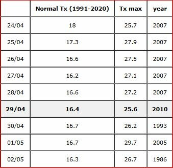 We moeten teruggaan naar 1985,1993, 2005, 2007 (met vijf opeenvolgende dagen) en 2010 om eind april-begin mei een warmte te vinden zoals die van de komende drie-vier dagen.