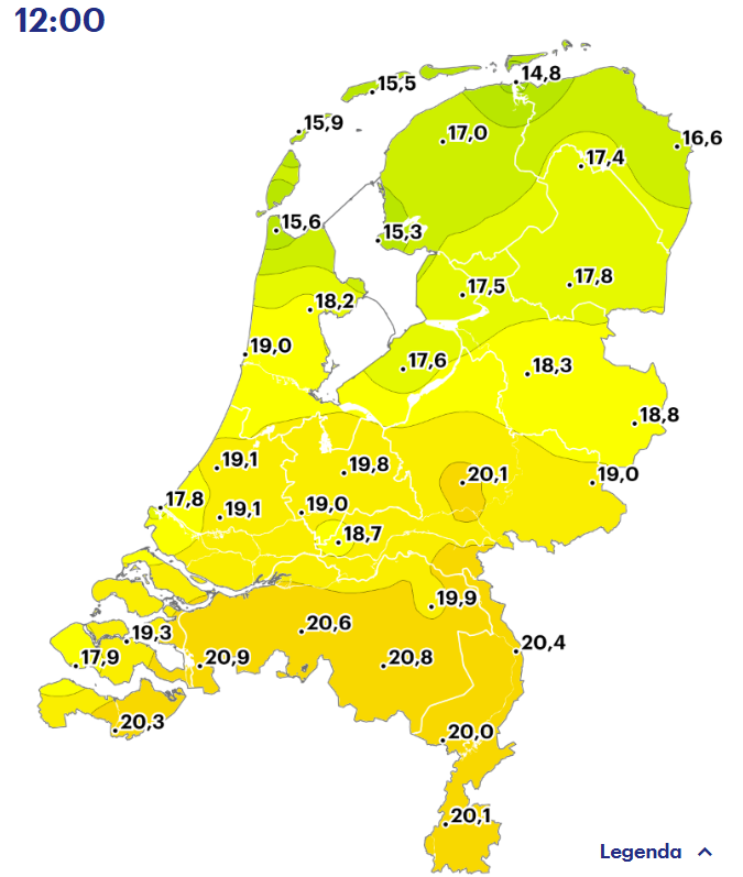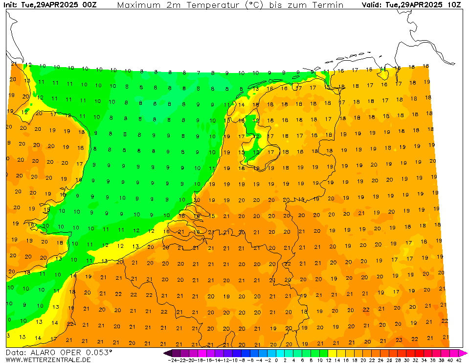 HARMONIE in het zuiden van Nederland wellicht een tikkeltje aan de koele kant. ICON-D2/AROME zitten duidelijk te laag met slechts op zeer lokale schaal 20 graden.