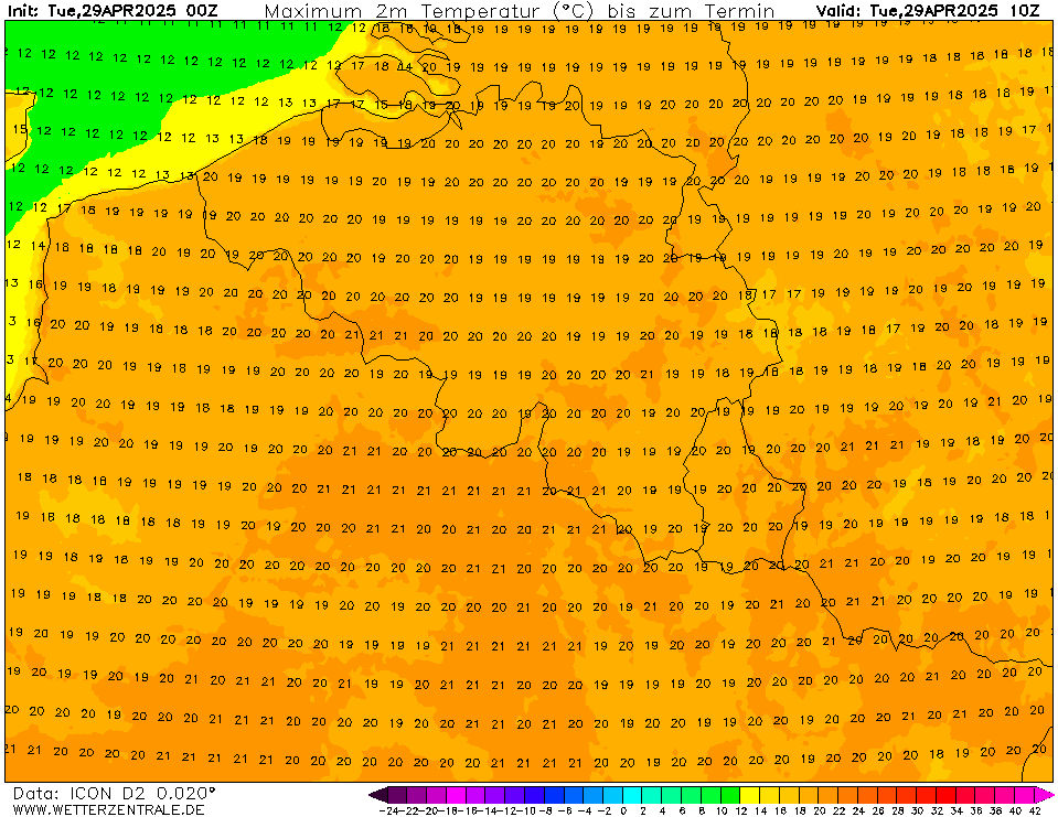Ja, omdat de 09z-run namelijk net geïnitialiseerd is. De 00z-run had voor 12:00 uur (lokale tijd) bijvoorbeeld slechts een zeer lokale 20 graden (oranje kleuren), terwijl het in ieder geval in Zuid-Nederland veelal 20-21°C was.
