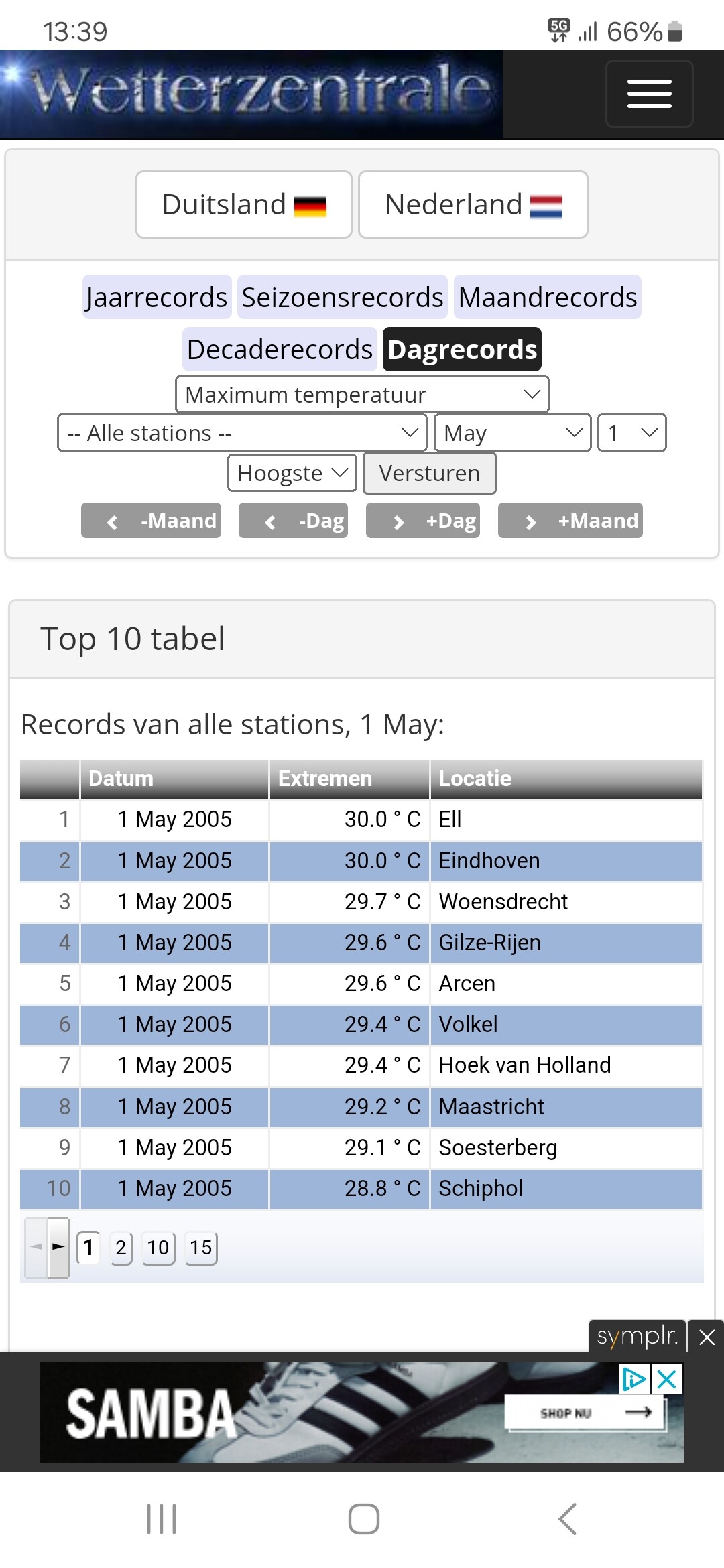 de 28.8°C op plek 10 en precies 30.0°C op een gedeelde plek 1 en 2, de gehele top 10 gemeten op 1 mei 2005.