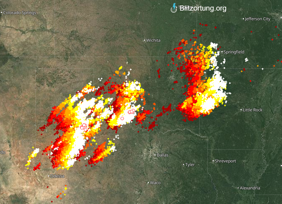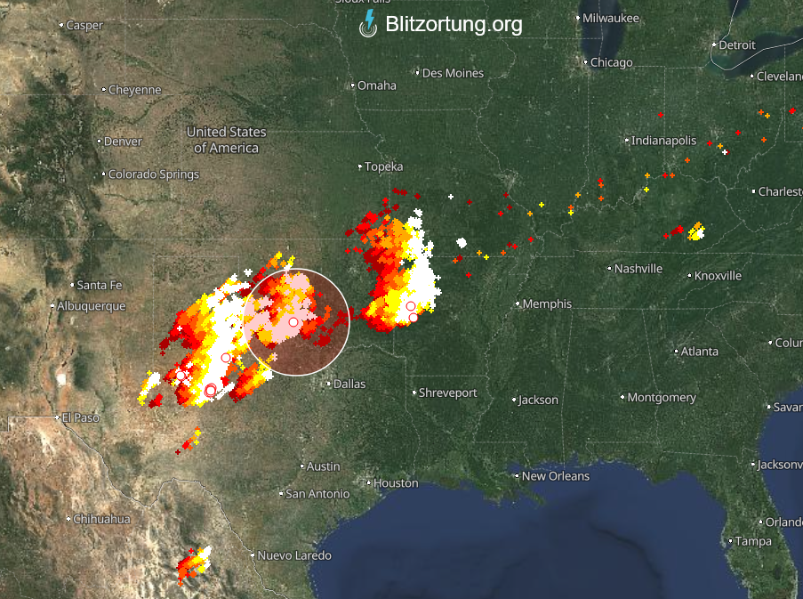 Zoals door Sjoerd afgelopen zaterdagavond aangekondigd is het de laatste dagen nogal zwaar weer in delen van de VS. Hier het beeld van de bliksemontladingen van daarnet. En daar is het nu nog maar tegen de ochtend! Er zijn misschien ook berichten over schade, al dan niet door tornado's, ik heb er nog niet naar gezocht.