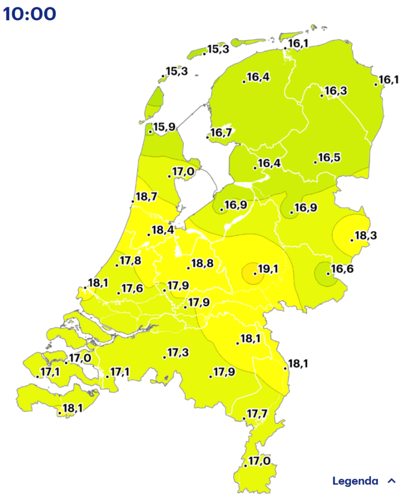 Hieronder een vergelijking tussen de gemeten temperatuur om 10 uur en de verwachting van Harmonie. Het is op veel plekken 1 à 2 graden warmer dan de verwachting. Vaak neemt die voorsprong richting (het eind van) de middag wel iets af, maar een zomerse dag zal er voor veel stations in het midden en zuiden wel in zitten vermoed ik. Ook goede kansen voor De Bilt, die nu redelijk voorloopt op de rest. En als het vandaag nog niet lukt dan morgen wel.