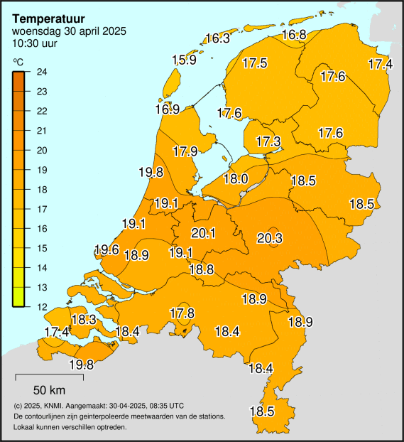 20,1 graden tegen 16,7 gisteren. Gisteren werd het uiteindelijk 22,4 dus zou je dat simpelweg extrapoleren naar vandaag (zo werkt het natuurlijk niet helemaal) kom je voor vandaag uit op bijna 26 graden.