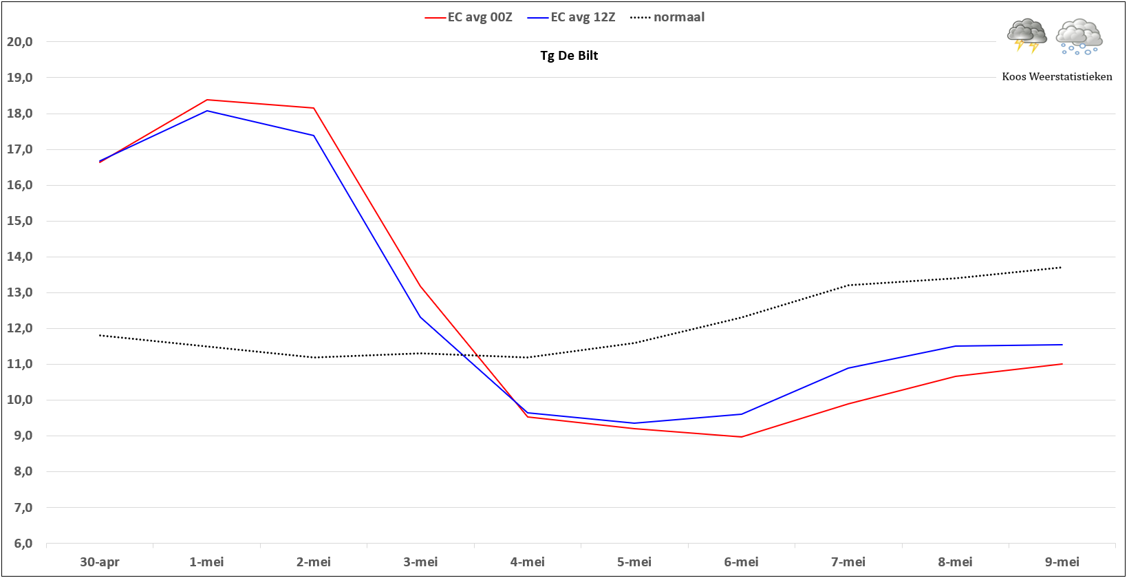 Wellicht morgen de eerste bijdrage aan het warmtegetal dit jaar als het gemiddelde boven de 18°C komt.