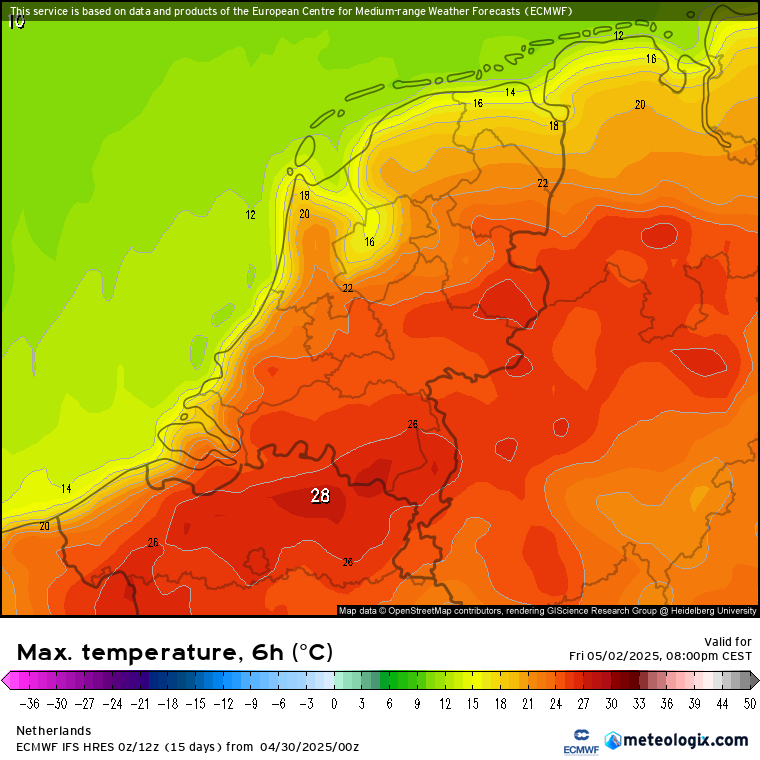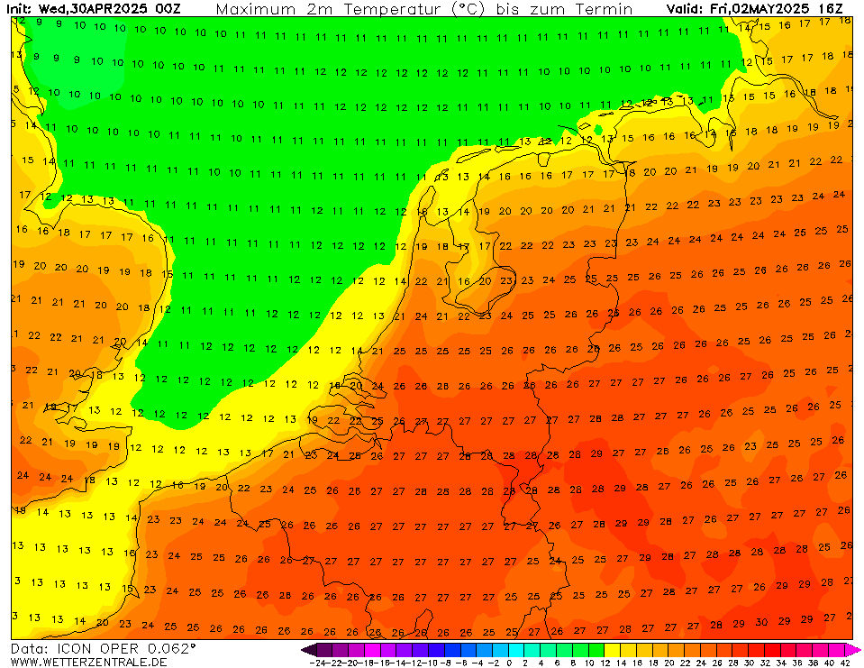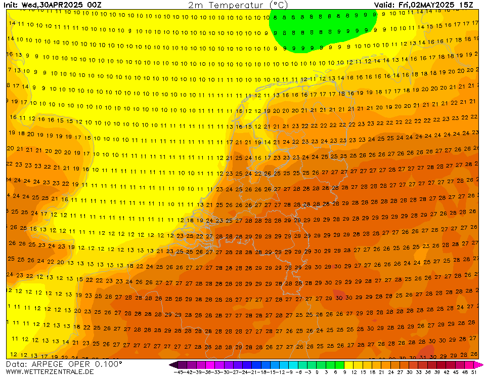 ICON komt met plaatselijk ruim 28 graden, maar komt voor vanmiddag met 'slechts' 24 - 25 graden in het midden van Nederland, dat zal wat aan de lage kant zijn. ARPEGE komt met een hoop 29'ers. ECMWF komt lokaal met ruim 27 graden, maar zal veel te laag zitten (vandaag 22 - 24 graden in Midden-Nederland).