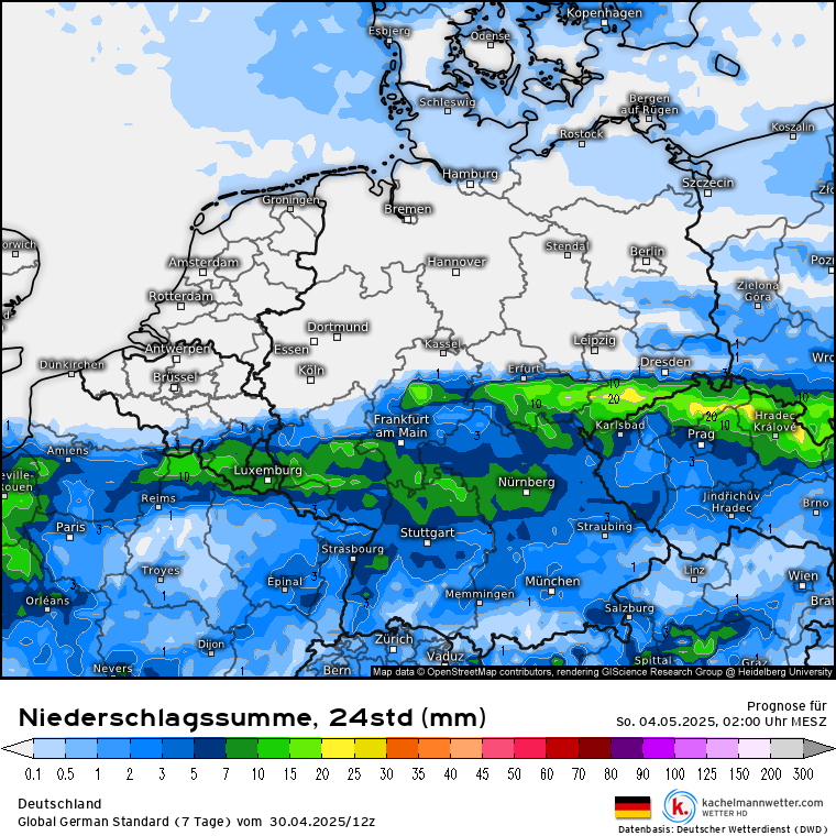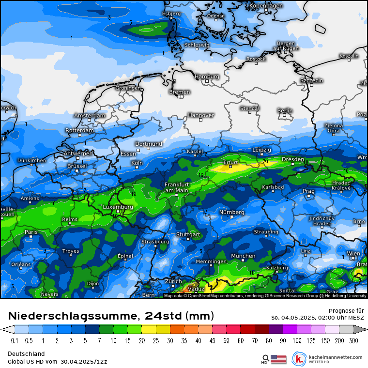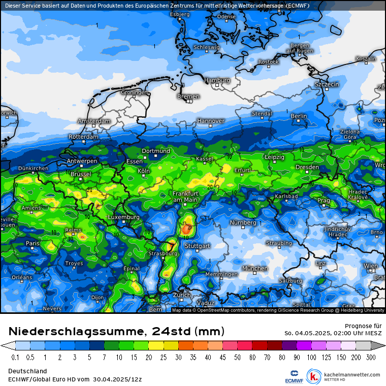 Eerst werd de meeste neerslag zuidelijk berekend, over noord Frankrijk naar het oosten (dat was trouwens ook op zondag), maar de recentere runs van de meeste modellen tonen een noordwaartse trend, tot soms aan zuid Nederland toe. Maar er zijn nog steeds flinke verschillen tussen de modellen, en ook per run.