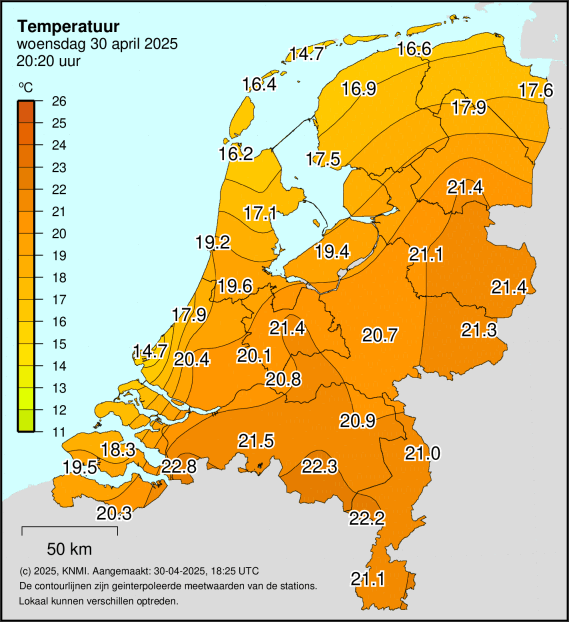 Koelt wel snel af, nog maar 20,9°C momenteel. Tegelijkertijd is het pas april en zitten we om 20:30 uur nog ruim boven de normale maximumtemperatuur. Hopelijk veel tropische dagen dit jaar, waarbij het in de kernzomer vaak rond 20:00 - 21:00 nog 30°C is.