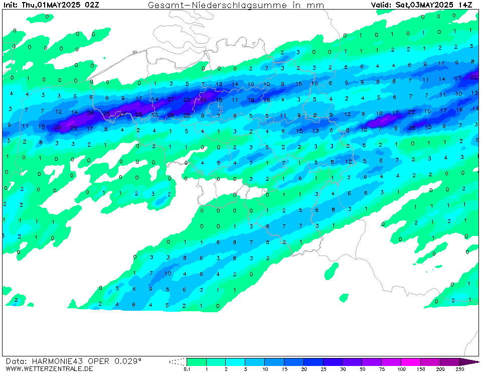 In navolging van EC toont Harmonie een actieve neerslagzone die vrij noordelijk uitkomt en grote delen van Vlaanderen treft.
