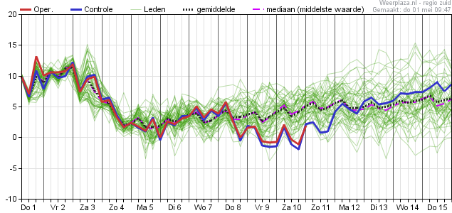 Daarbij dauwpunten tot en met morgen van 10-12 graden, kelderend naar een graad of 2-3 vanaf aankomende zondag: