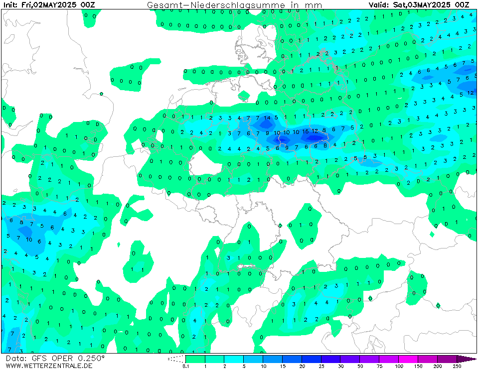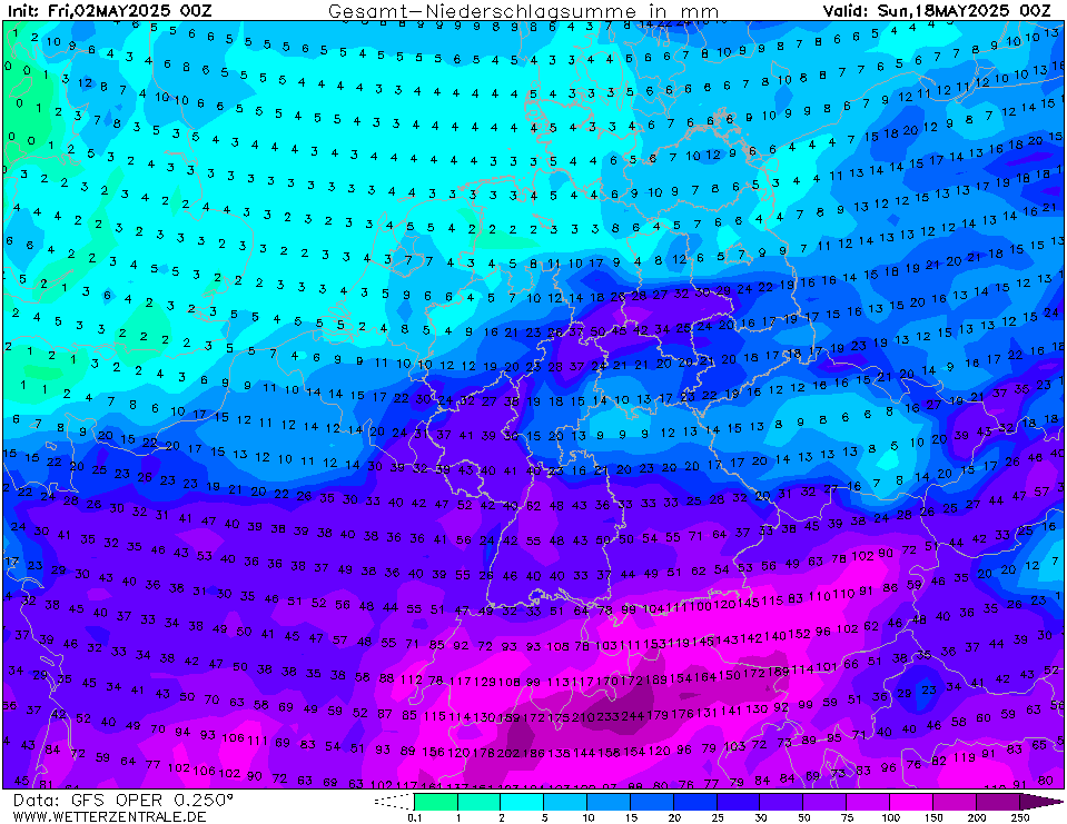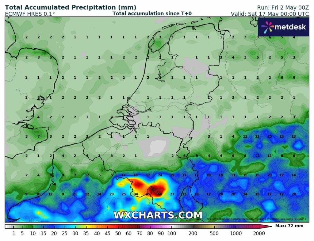 De neerslag komende twee weken moet vooral vanmiddag hier vallen. Nou, de kans hierop weten we ook wel: 0,1 %. EC-oper is zelfs geheel droog. Voorlopig dus geen neerslag meer.