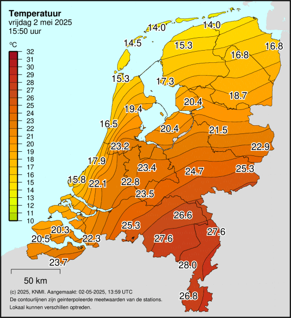 Hier drukkend zomers warm ...wind noord en veel zon.