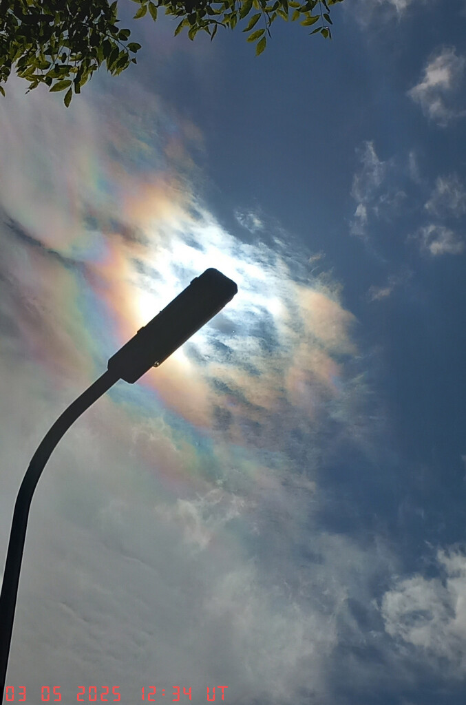 In de altocumulusvelden waren sterke optische verschijnselen te zien, zoals deze meervoudige en sterk gekleurde krans. de omvang van de krans - de straal van de buitenste ring was 8 booggraden - getuigt van een maar heel geringe grootte van de wolkendruppeltjes.