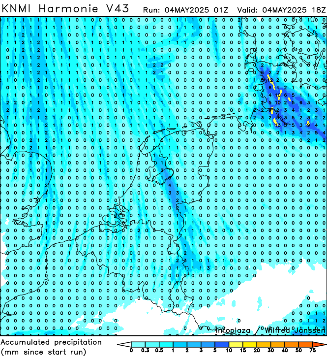 Het water is vandaag warmer dan het land (watertemperatuur zo’n 16 graden), dus buien zullen daar sneller getriggerd worden en vervolgens richting het zuidoosten trekken. Hier zijn de tegels ook nat en de komende uren kan hier misschien ook wel 1-3 mm vallen uit die strook. Duidelijk te herkennen bij Harmonie: