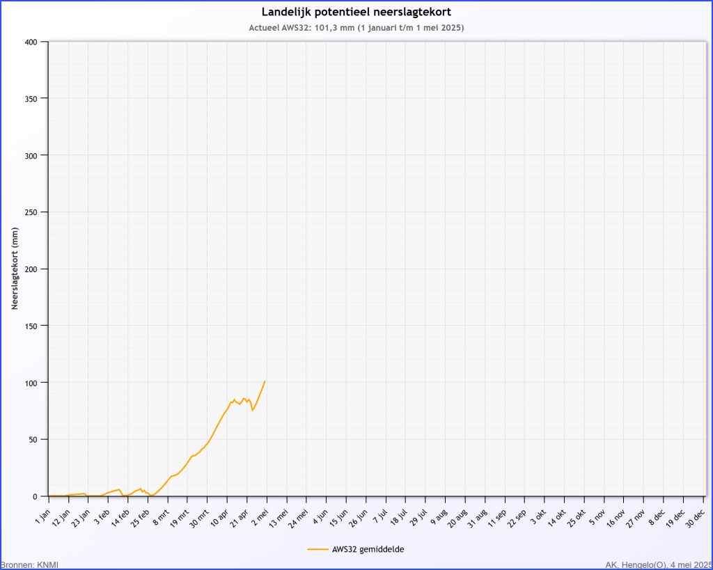 Kijk je naar het landelijk gemiddelde van de AWS (32 stations waar zowel neerslag als globale straling gemeten wordt) dan ziet dat er vanaf 1 januari zo uit voor het potentieel neerslagtekort: