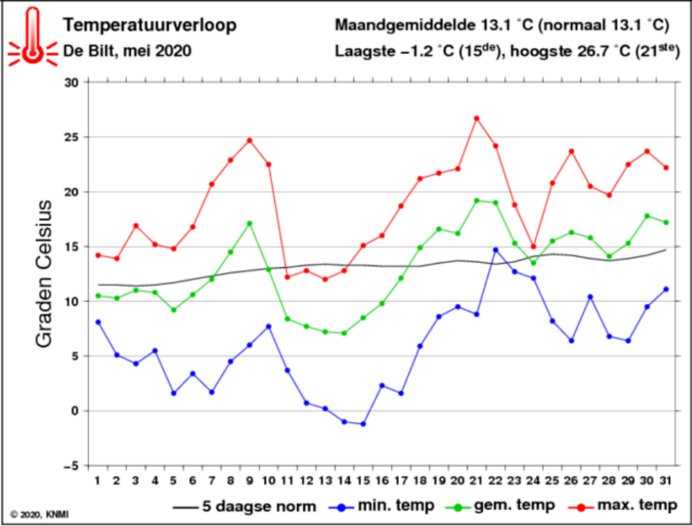 Mei 2020 voor het laatst vorst met IJsheiligen op 1,5m (De Bilt)