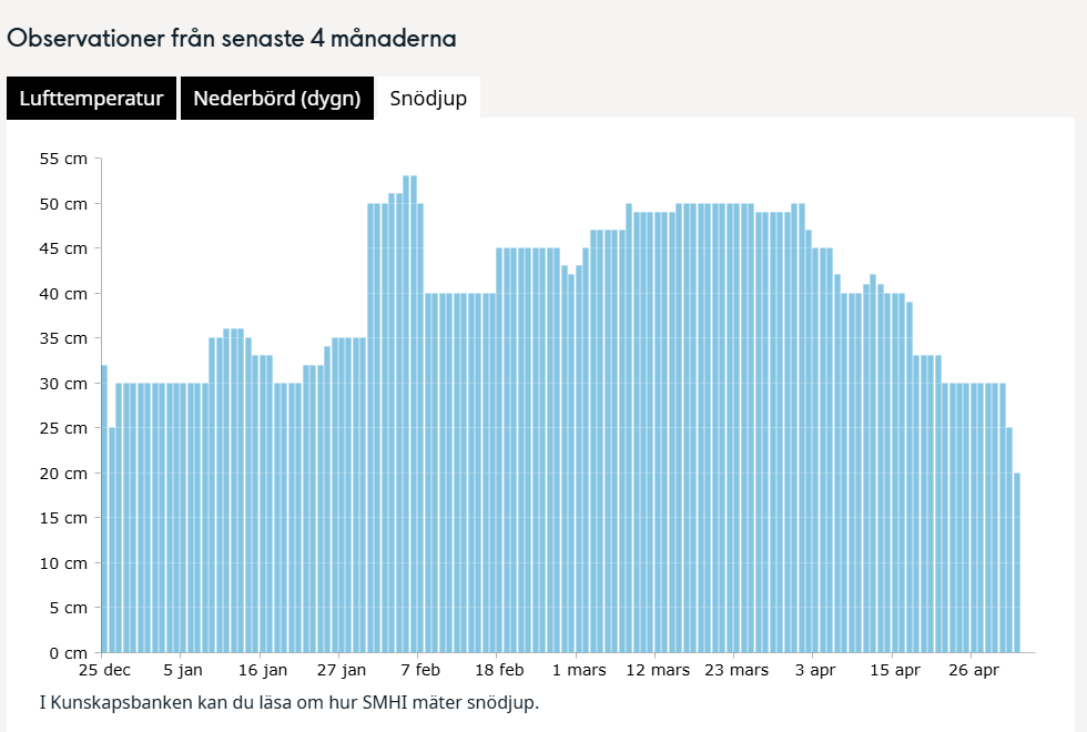 Onderstaande grafiek is voor Esrange in de buurt van Vittangi. 1 mei lag er nog 25 cm sneeuw en nu is alles weg. Of er zijn geen metingen doorgegeven en er ligt nog wel sneeuw maar dat durf ik niet te zeggen. (bron: SMHI)