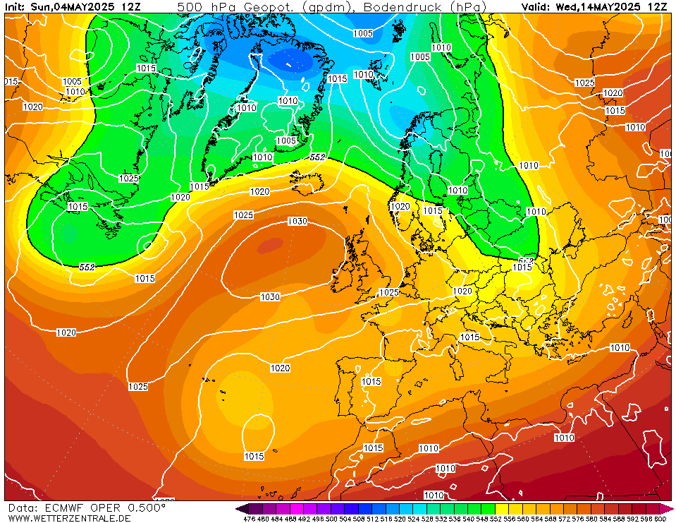 Er valt simpelweg geen verandering te bespeuren. Ook EC vannavond is duidelijk: de kaart op 240h is bijna een kopie met de huidige situatie, alleen de positie van het hoog (en dus de te verwachten temp) schuift wat.