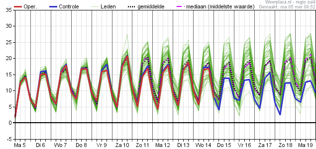 Gisteren de meest frisse dag, maar alsnog bijna 16 graden in Ell. Vanaf vandaag telkens (ruim) boven de 15 graden landinwaarts, zo lijkt het.