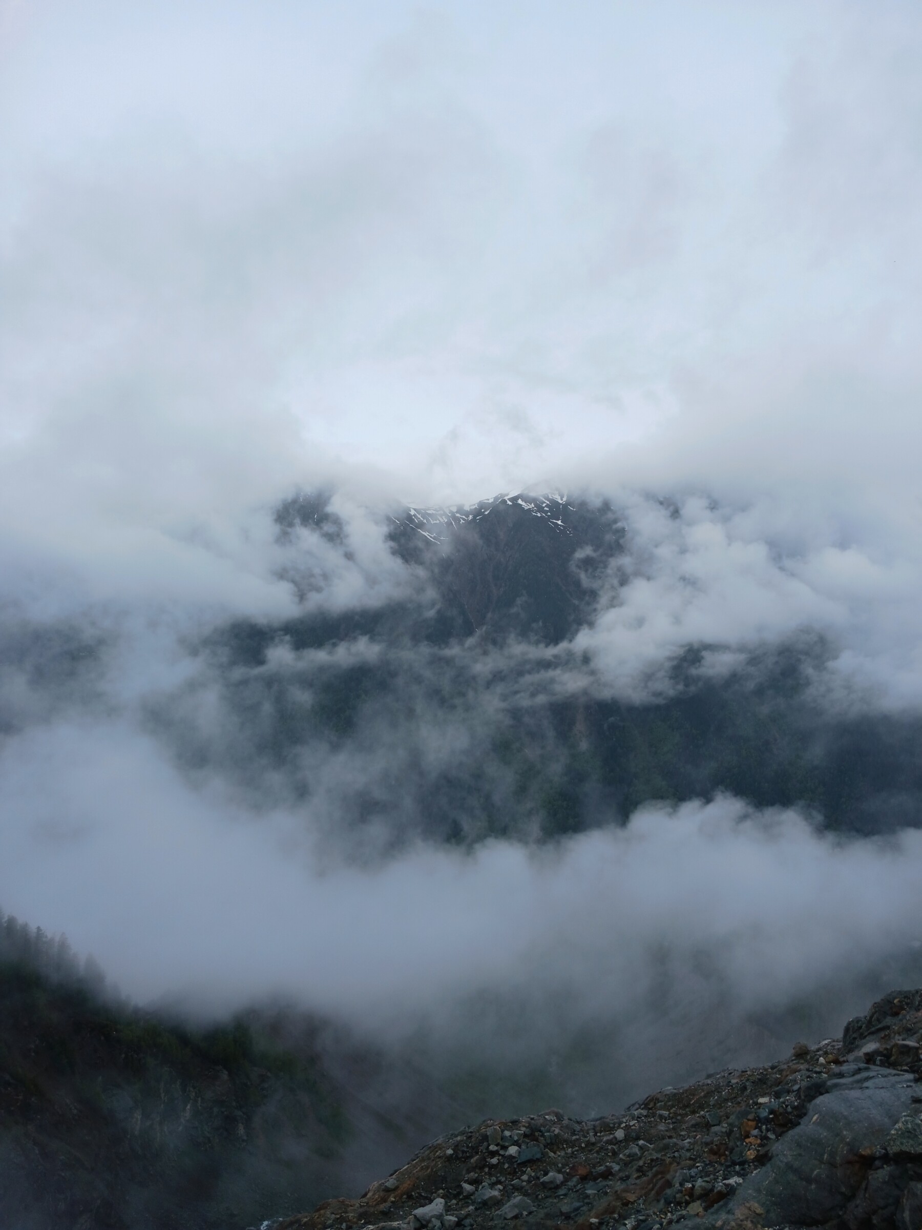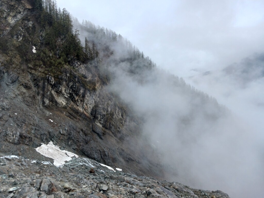 Verder konden we mooi de wolken bekijken. Af en toe verdwenen we in de mist en soms konden we het dal inkijken. Opvallend waren de plukken fractus die tegen de berghelling opgestuwd werden.