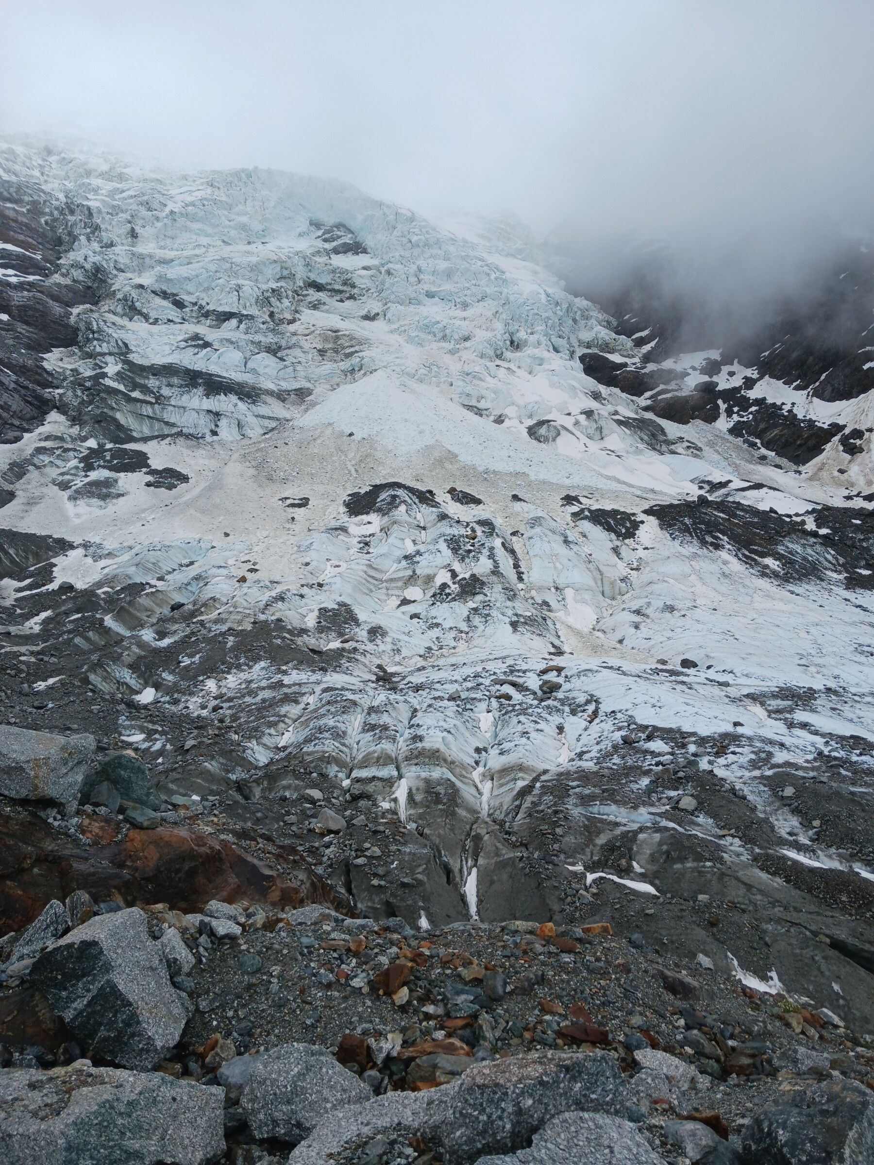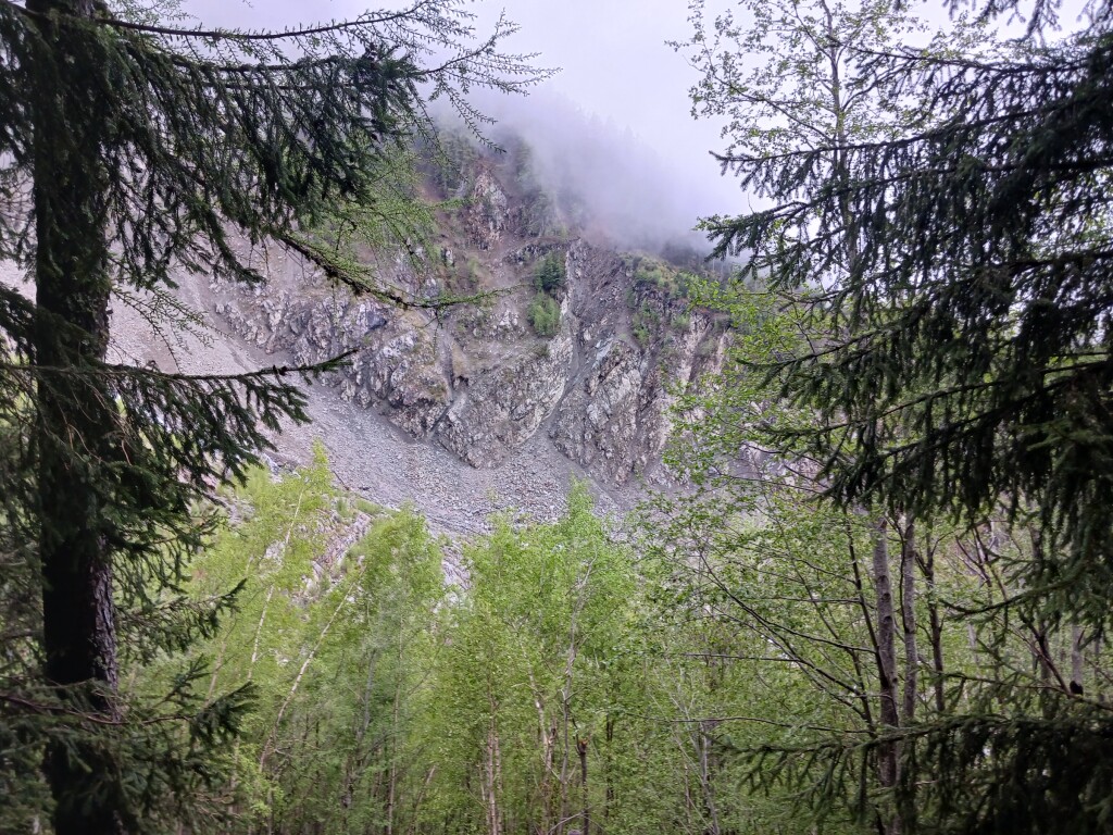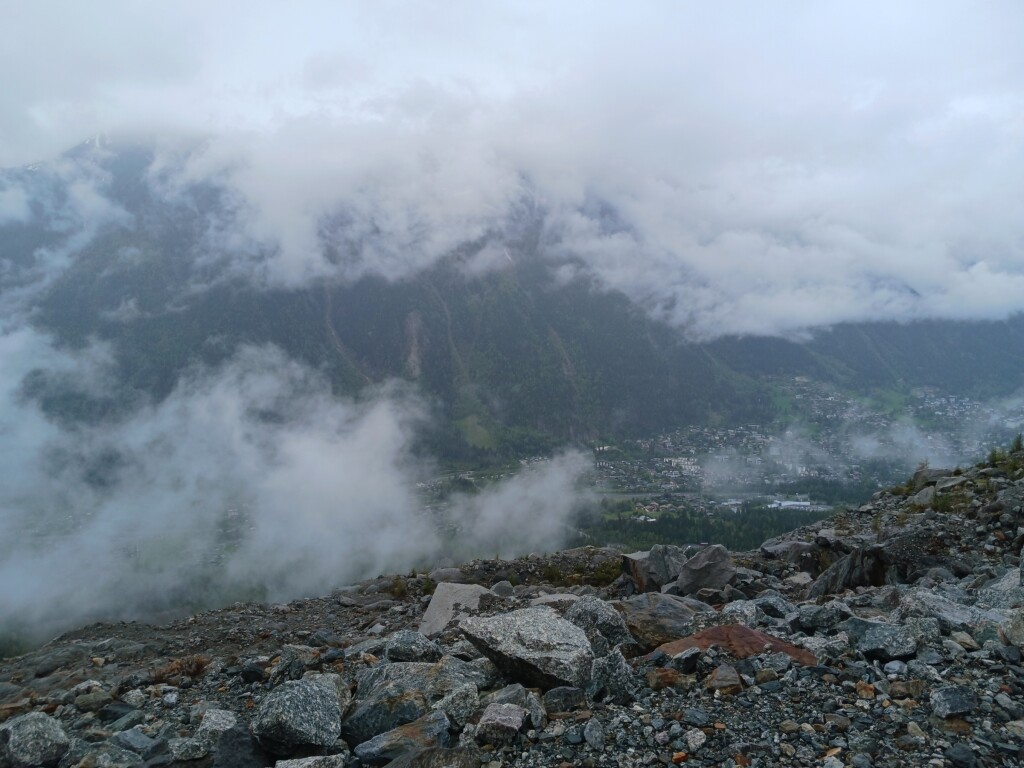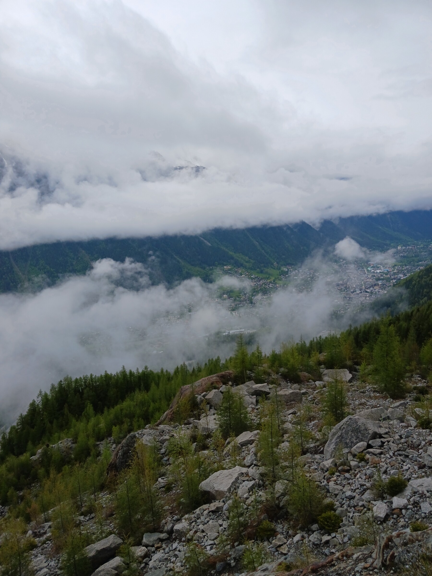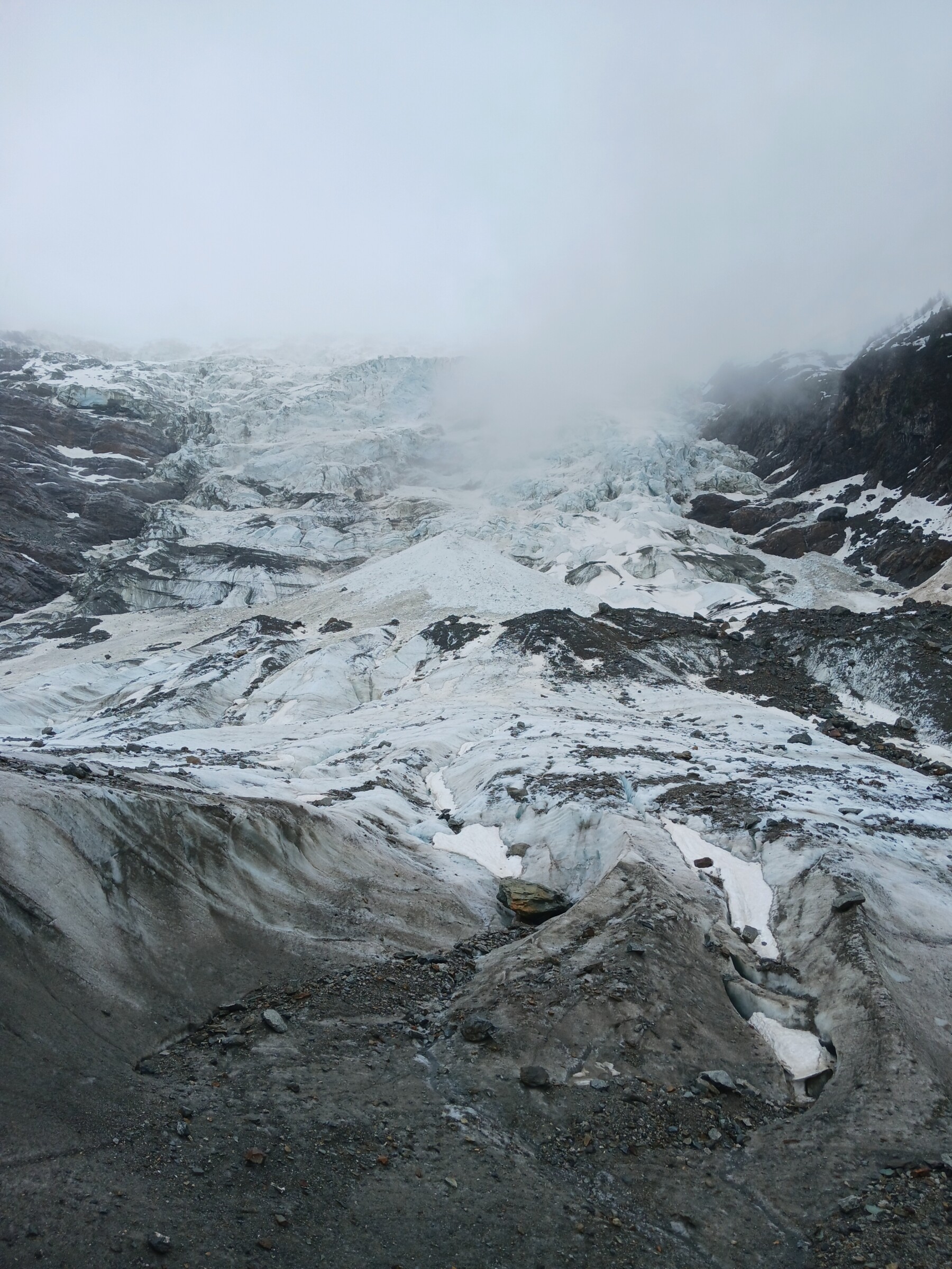 Vandaag liep ik met een studiegenoot naar de Bossons-gletsjers (~ 1700 meter hoog). De temperatuur lag daar rond de 4 °C. Ondanks dat lagen op veel plekken hoopjes sneeuw.