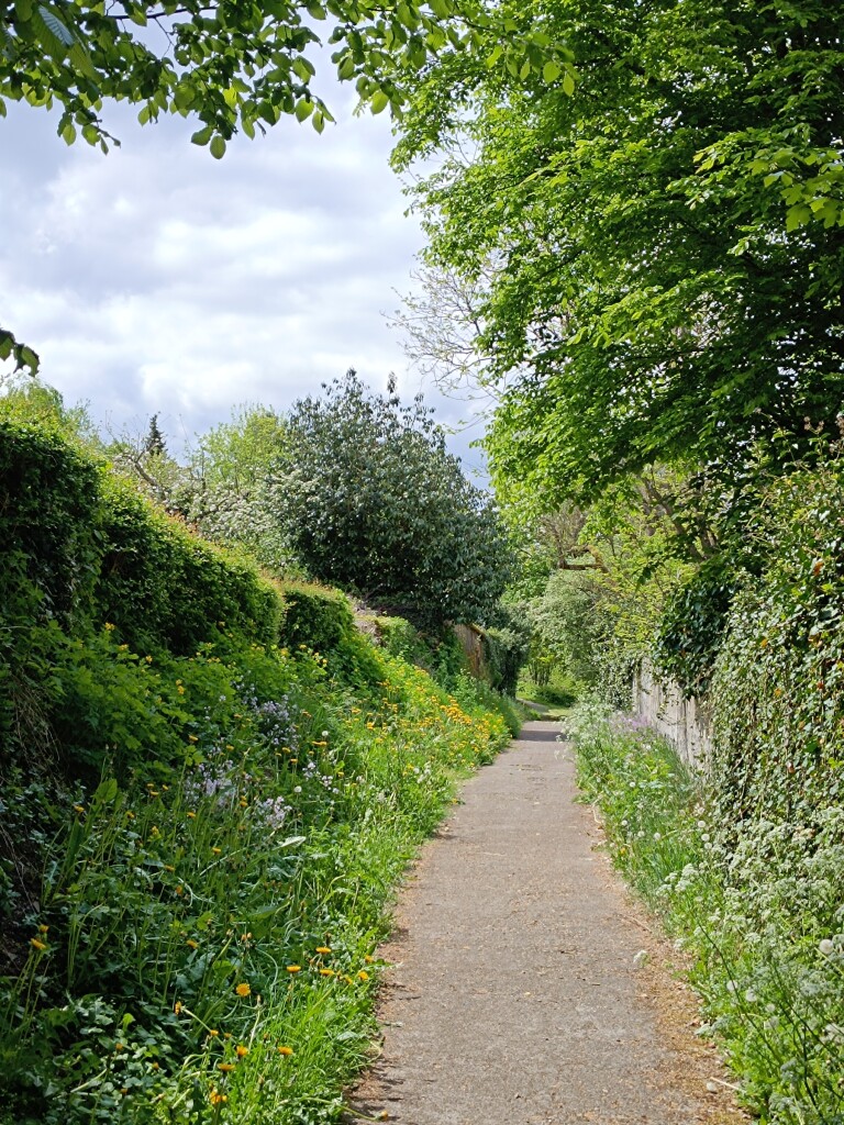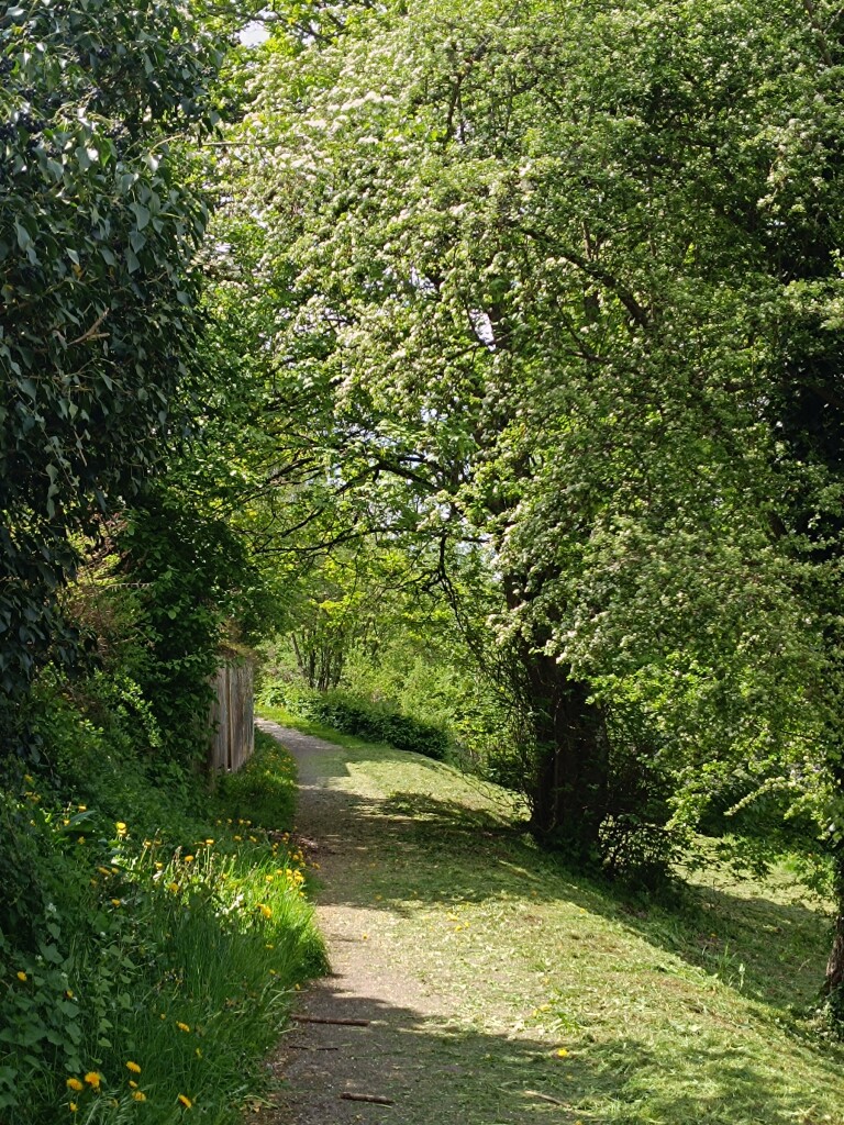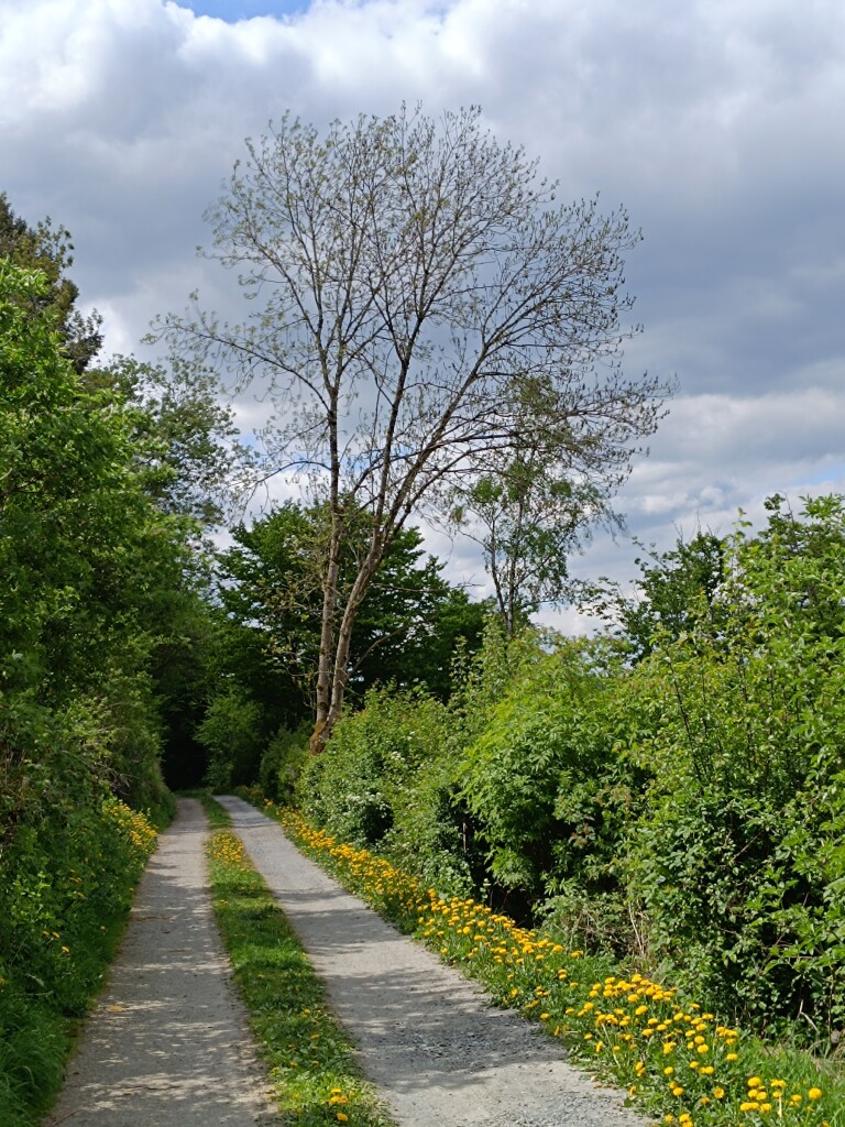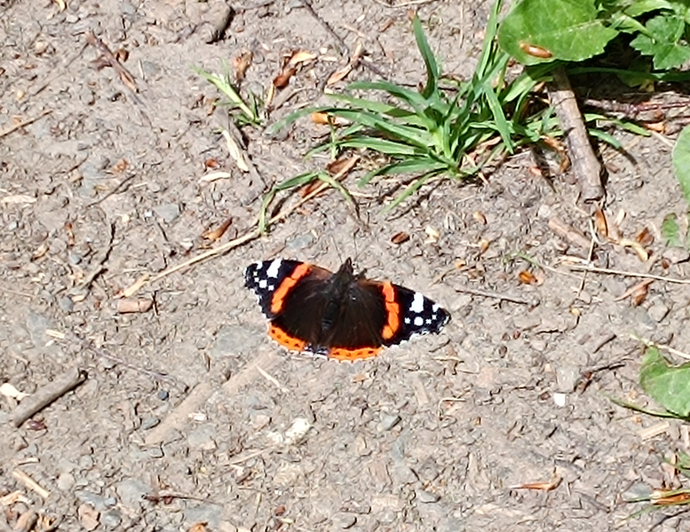 Tijdens mijn wandeling kwam de zon tevoorschijn. En Atalanta-vlinder zat zich daarin te warmen op het smalle bospad. Verder wat foto's van onderweg. Op de derde foto kun je zien dat het gras net gemaaid was. De boom op de laatste foto is duidelijk niet gezond; zo zijn er hier wel meer. Afgelopen herfst verloor een andere boom geen bladeren, maar takjes met vier bladeren tegelijk. Die komt nu ook maar mondjesmaat in blad. Die is rechts op de vierde foto nog net te zien.