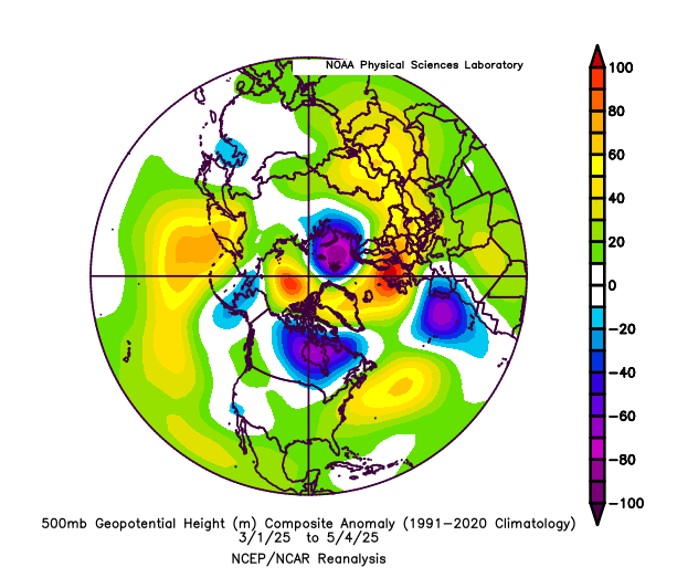 Tussen Schotland en Denemarken, gemeten vanaf 1 maart. Niet een noordelijke straalstroom, want dan is het ook droog in Spanje. Zoals in de hittegolf van 2003.
