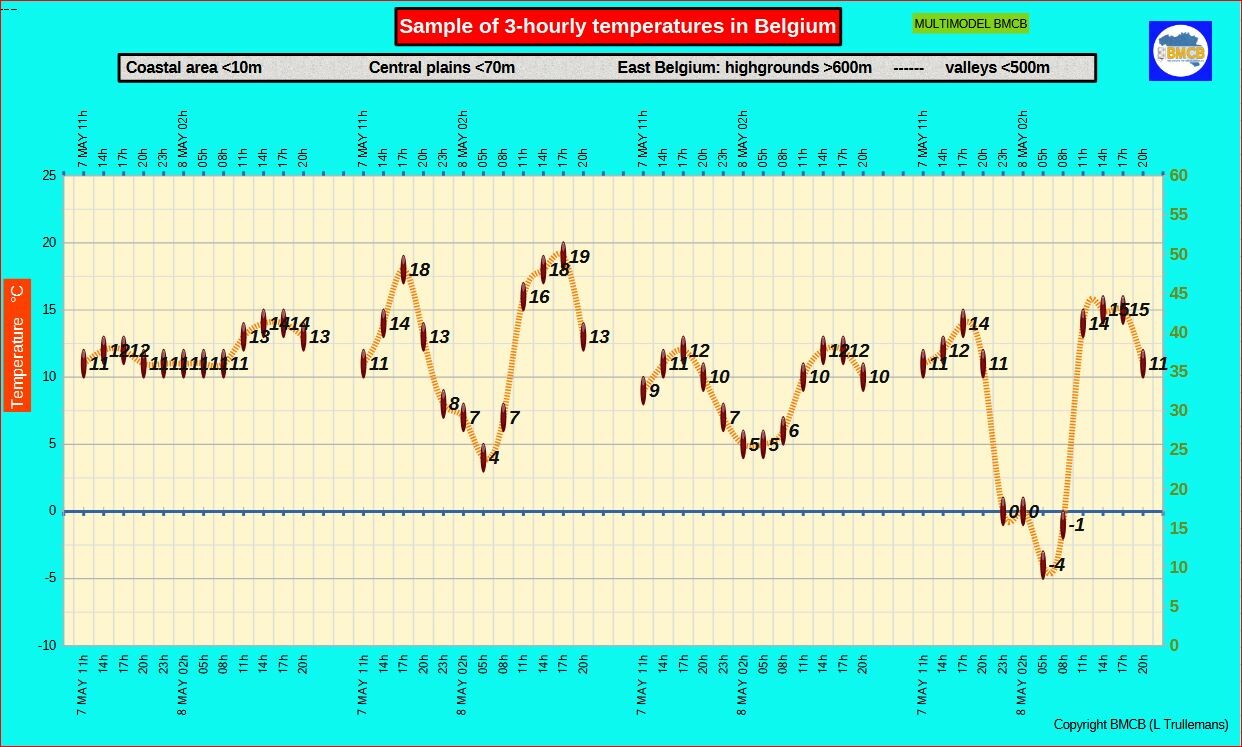 Minima: rond 11°C aan zee, 10–4°C in het binnenland, 3 tot -4°C in de valleien ten zuiden van Samber en Maas.