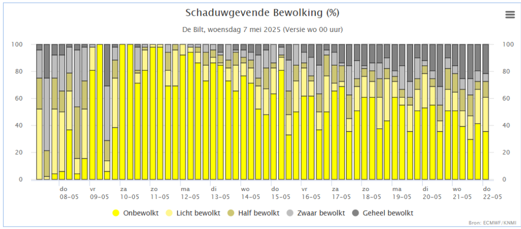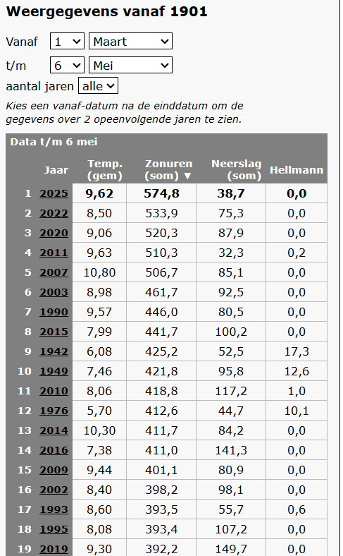 Van 1 maart t/m 6 mei liggen we prima op koers. We hebben 41 zonuren meer dan 2022 en 55 meer dan 2020.