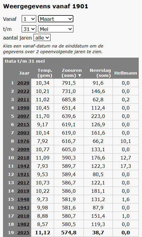 Van 7 t/m 31 mei kwam er in 2020 nog 271,2 zonuren bij en in 2022 nog 197,1 zonuren.