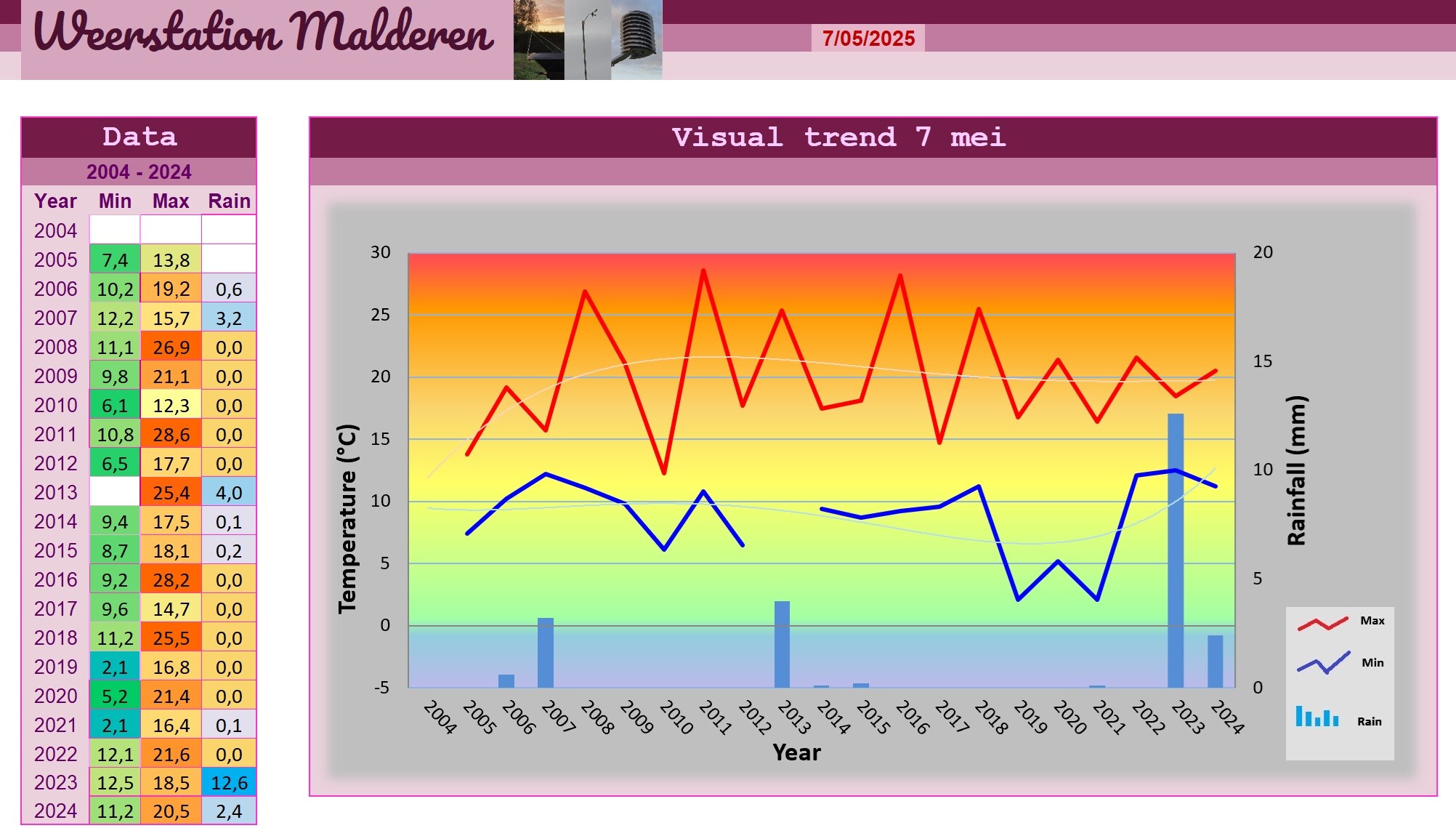 Tijdens de ochtend lagen we nog steeds onder invloed van de regenzone die weer wat naar het zuiden is getrokken en boven ons land een stille dood lijkt te sterven. Veel activiteit zat daar in vergelijking met gisteren dus niet meer op al was het wel genoeg voor een druilerige, grijze en kille start van de dag. In de loop van de voormiddag werd het geleidelijk droger en begon het licht dat door het wolkendek drong, intenser te worden. Het neerslagtotaal stagneerde op 2,4 mm en dit zou ook het dagtotaal worden. Tegen de middag zagen we ook al de eerste stukjes blauw verschijnen tussen een mix van Stratus fractus en Stratocumulus, en tijdens de uren daarop begon het vanuit het noorden steeds verder op te klaren. Al ging dit proces vrij langzaam en zeker ten zuiden van ons heeft men echt heel lang op die opklaringen moeten wachten. Eens de zon er in Malderen regelmatig doorheen begon te prikken, zagen we de wind gevoelig aanwakkeren uit noordelijke richtingen waar het tot halverwege de namiddag nog zo goed als windstil was. Dit zorgde ervoor dat de verzopen omgeving weer wat kon opdrogen maar liet het tegelijk een stuk killer aanvoelen dan dat de maxima van 20,5 graden lieten vermoeden. Niet dat het hiermee echt onaangenaam koud werd, maar het maakte dit weertype wel erg verraderlijk voor zonnebrand die men dikwijls pas opmerkte als het al (lang) te laat was. Naast de opklaringen ontstonden er ook stapelwolken maar hoewel deze erg fors uitgroeiden en het er soms nog dreigend donker uitzag, hielden we het hier nog droog. Tijdens de avond begonnen deze dan in elkaar te zakken en op te lossen door het wegvallen van de thermiek. Uiteindelijk werd het zelfs helemaal helder. De wind zwakte ondertussen ook weer wat af al moesten we echt tot na zonsondergang wachten eer die volledig ging liggen. Het koelde daarbij ook flink af, wat in deze polaire luchtsoort in combinatie met open hemel ook geen wonder was. We kwamen zo uiteindelijk op de minima van 11,2 graden terecht. Een nog verdere afkoeling lijkt echter onwaarschijnlijk want zowel op de satellietbeelden als in de waarnemingen op bepaalde weerfora zagen we nu steeds meer aanwijzingen dat een omvangrijk gebied van Stratus en mist zich vanuit de Noordzee over de Lage Landen begon uit te breiden. Wellicht is het dan ook een kwestie van uren of zelfs maar minuten eer dit grijze spook ook Malderen zal opslokken.