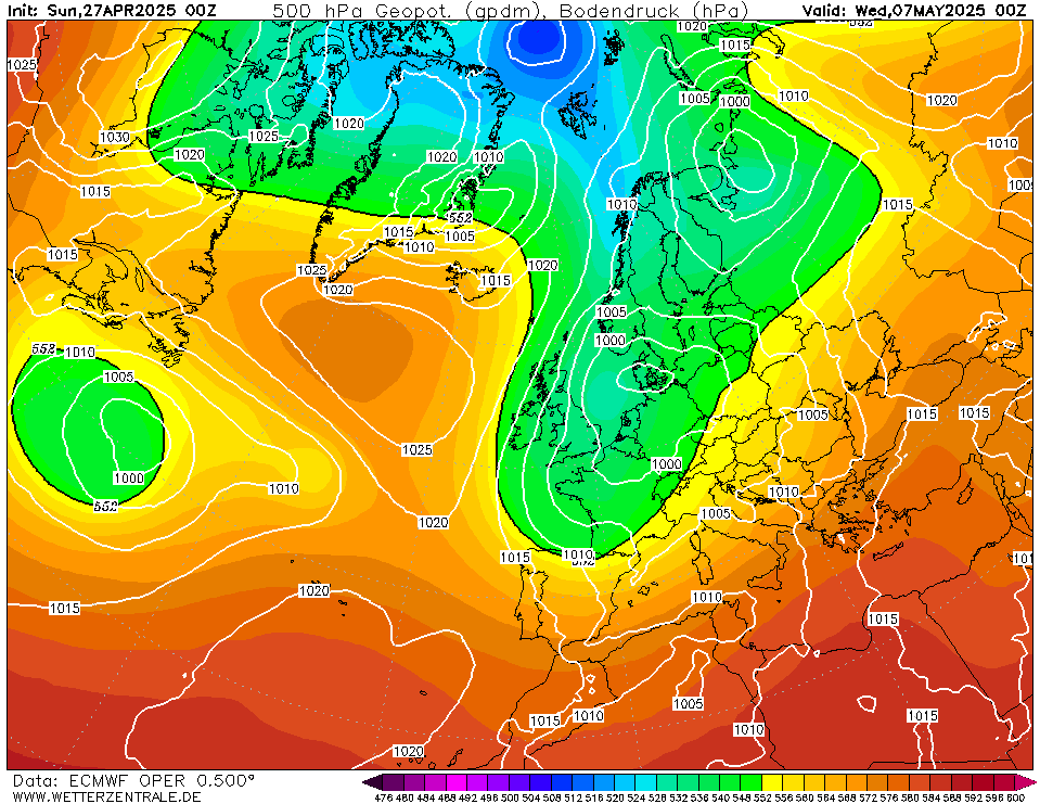 Als dat uitkomt inderdaad. Zie bijvoorbeeld deze EC 12z oper kaart van 10 dagen geleden. Van GFS heb ik helaas geen verleden operkaarten ter vergelijking.