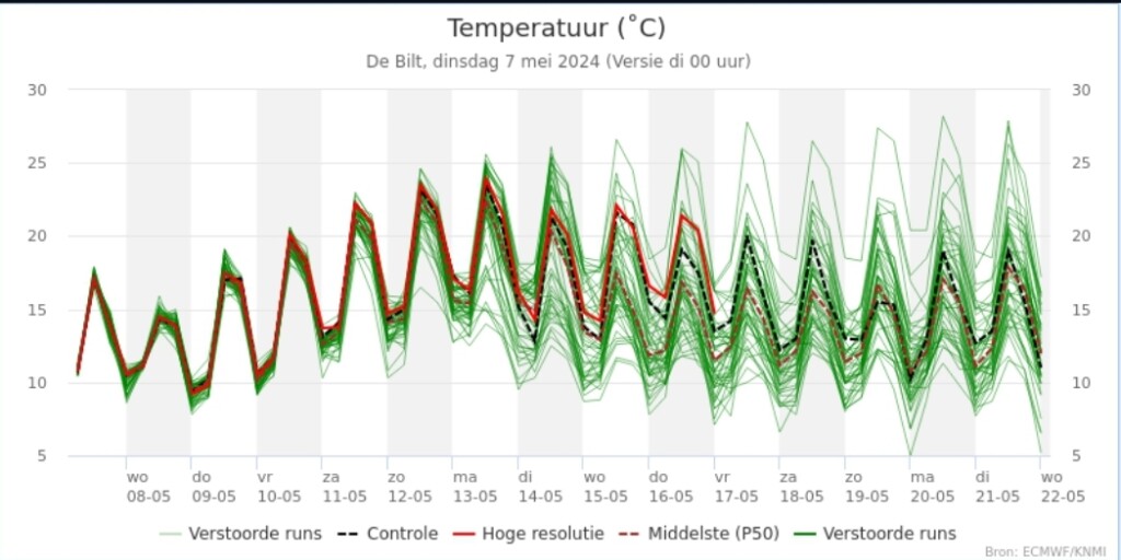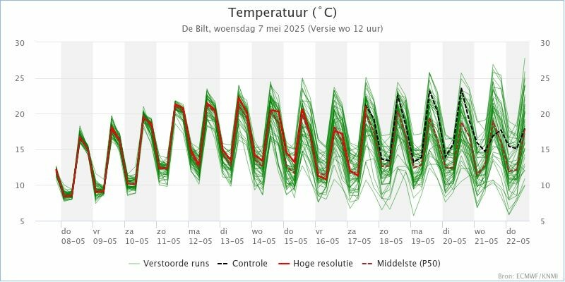 Alleen de pluim van toevallig 7 mei 2024 komt gedeeltelijk in de buurt. Op 3 dagen net iets warmer rond 11-13 mei. Verder overtreft de pluim vanavond deze voor de hele looptijd.