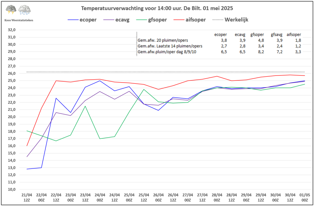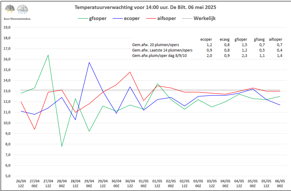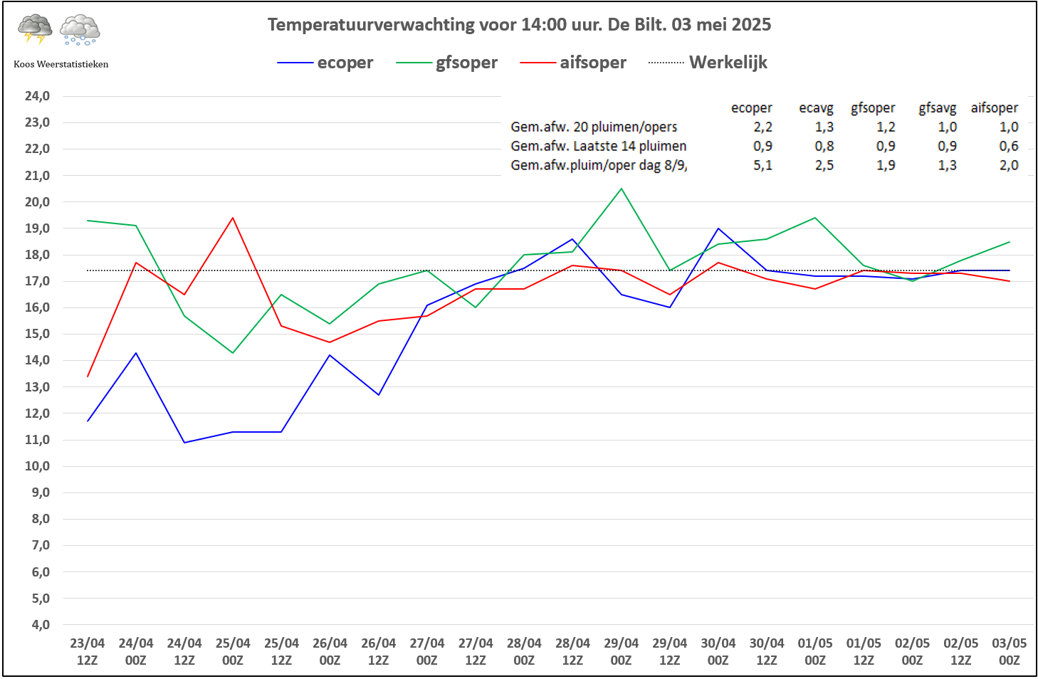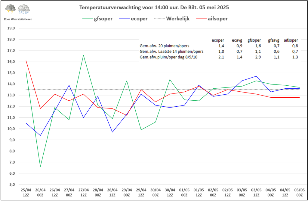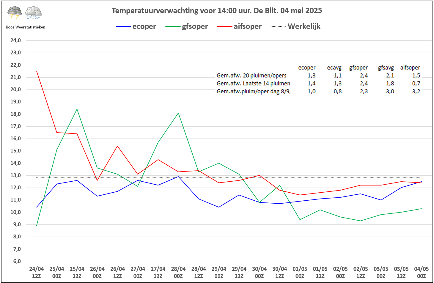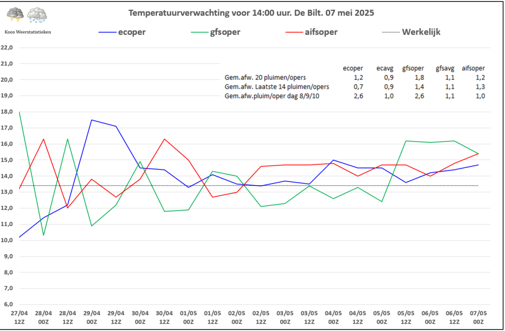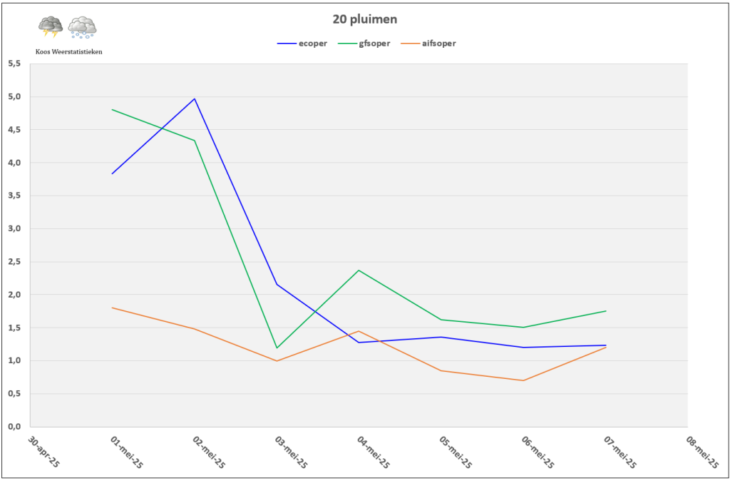 Iedere dag komen er expertpluimen. Ik pak dan daaruit de ensemblegemiddelden en de opers van 00Z en 12Z van AIFS (hier allen de oper), ECMWF, GFS. Daaruit lees ik de verwachting voor 02:00/08:00/14:00 en 20:00 uur af.