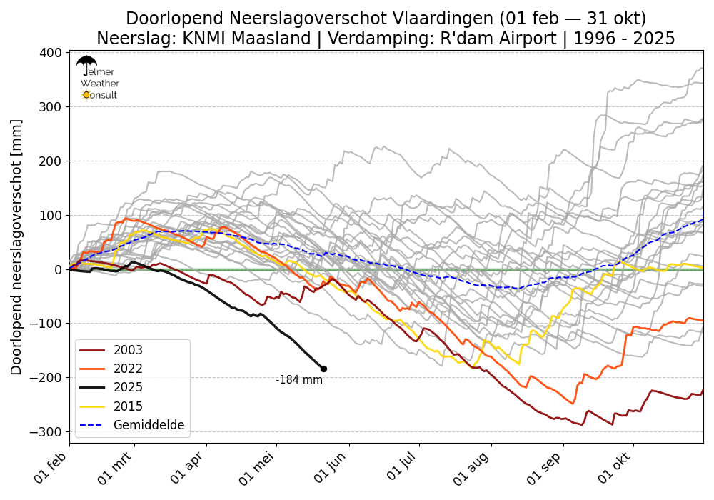 Geen enkel jaar sinds 1996 dat daarbij in de buurt komt. Maar we hebben dan ook te maken met vier (extreem) droge maanden op rij. Het jaar 2003 wist in het begin nog te volgen dankzij een eveneens erg droge februari t/m april, maar in mei werd het beduidend natter. Later in de zomer overigens weer aanhoudend droog, en zodoende het droogste jaar in de tijdreeks als je rekent vanaf februari. Het ene grijze lijntje dat eind mei nog tussen 2003 en 2025 in zou zitten is 2011 met een tekort van 94 millimeter op 20 mei, maar ook dat komt dus niet in de buurt.