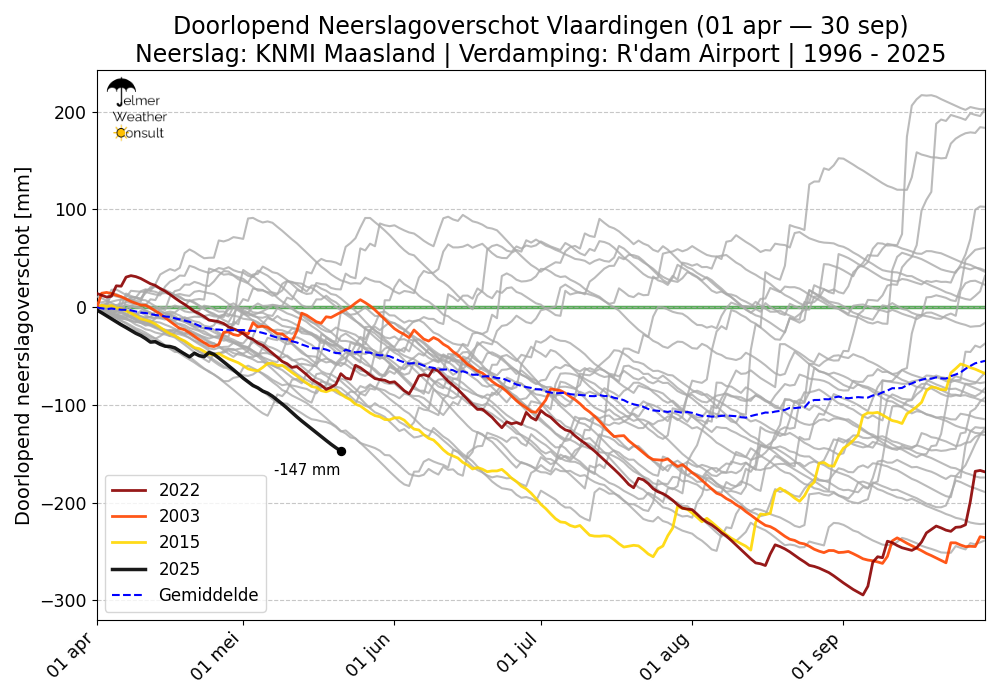 De twee lijnen die 2025 nog enigszins volgen zijn 2011 en 2020 met beide een tekort van 127 mm op 20 mei (gerekend vanaf 1 april), maar de zomer van 2011 verliep vervolgens extreem nat (443 mm) en ook de zomer van 2020 was in deze regio allesbehalve droog (299 mm). De trends voor deze zomer zien er echter heel anders uit, zoals eerder al besproken.