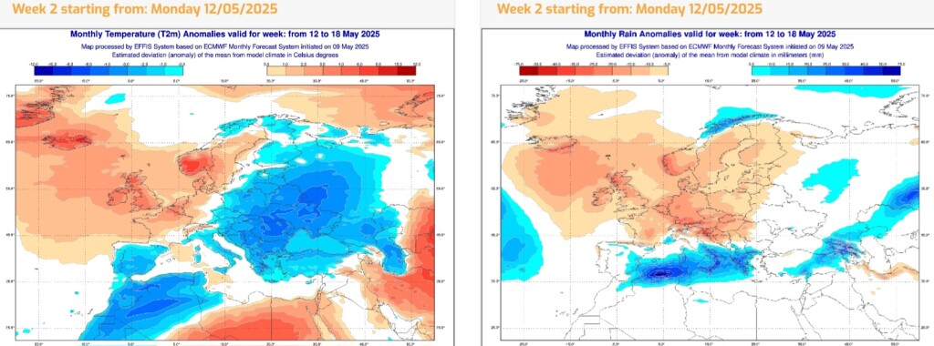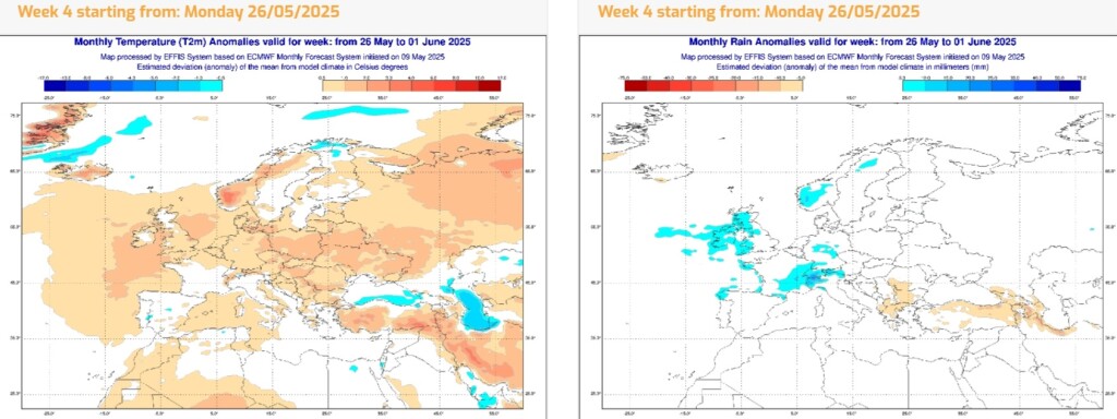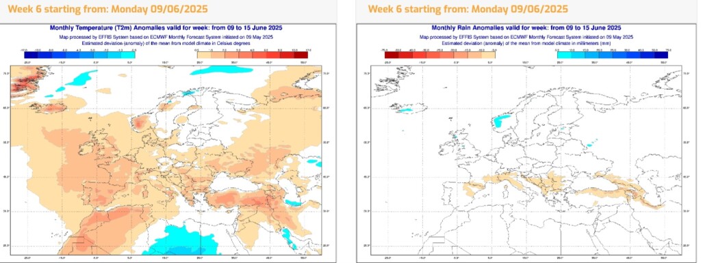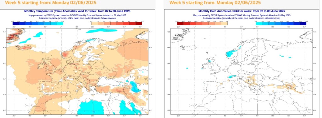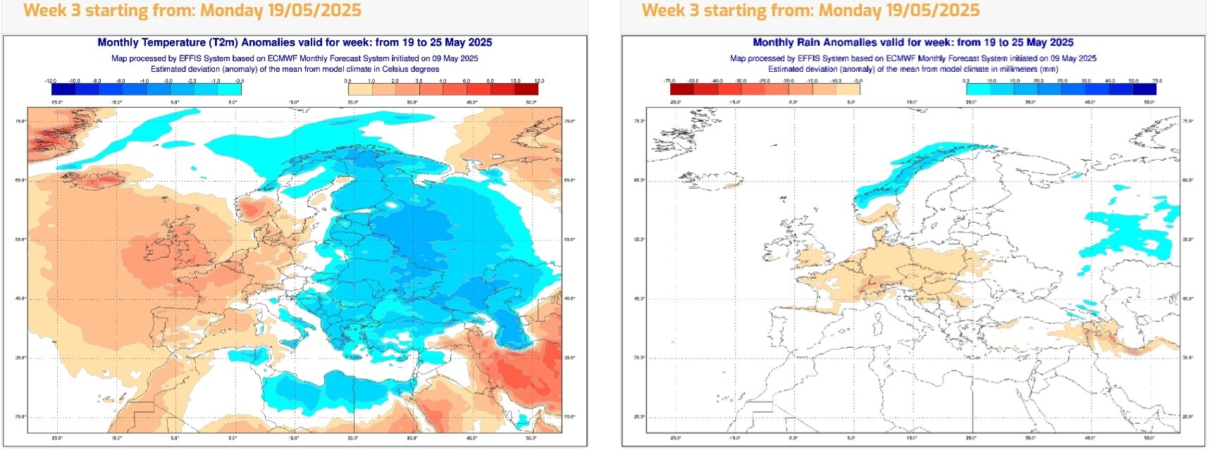 Maar vanaf de week erna lijkt er al iets te gaan veranderen. Het droge gebied schuift in de week van 19 mei al iets verder naar het zuiden toe, en ten noorden van ons zien we ineens natte anomalieën op de kaarten opduiken. En de koude anomalie boven Zuid-Europa verdwijnt geleidelijk. In de week erna is het beeld helemaal veranderd. Dan zien we boven Zuid-Europa juist droge anomalieën en boven het noorden van Europa en IJsland natte anomalieën. Dat blijft de weken die volgen, ook zo. Daarbij in vrijwel heel Europa vanaf week 2 temperaturen boven het langjarig gemiddelde.