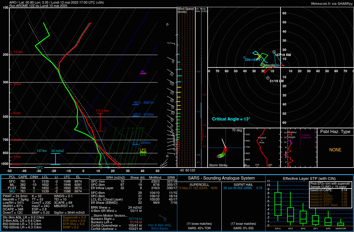 Volgens onderstaande model sounding. Dit is wel een paar uur van tevoren aangezien de grenslaag op een later tijdstip te erg verstoord is door de buien bij Arome. Je ziet dat de wind ten opzichte van de bui (rightmover) wat ruimt met de hoogte, vandaar dat er dan ook wat laminaire structuren te zien waren aan de windluwe zijde van de stijgstroom. In absolute termen is de windschering niet heel sterk natuurlijk. De onstabiliteit was vrij laag door de relatief droge grenslaag.